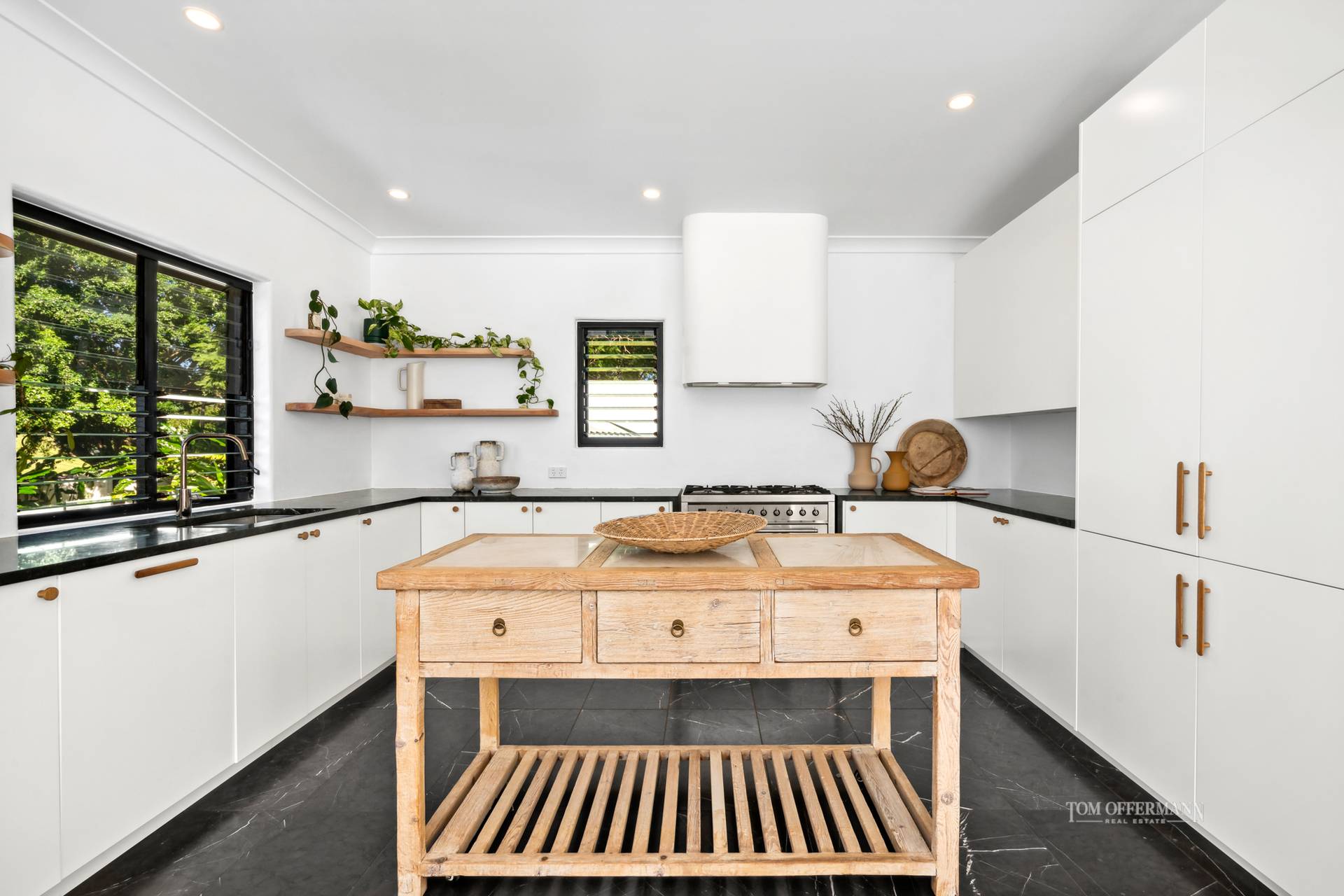 Catering to the entertainer is the L-shaped kitchen with black granite-topped cabinetry, washed timber island with white marble insets, tactile white cement splashback and the latest high-end appliances including a six-hob gas burner cooktop.