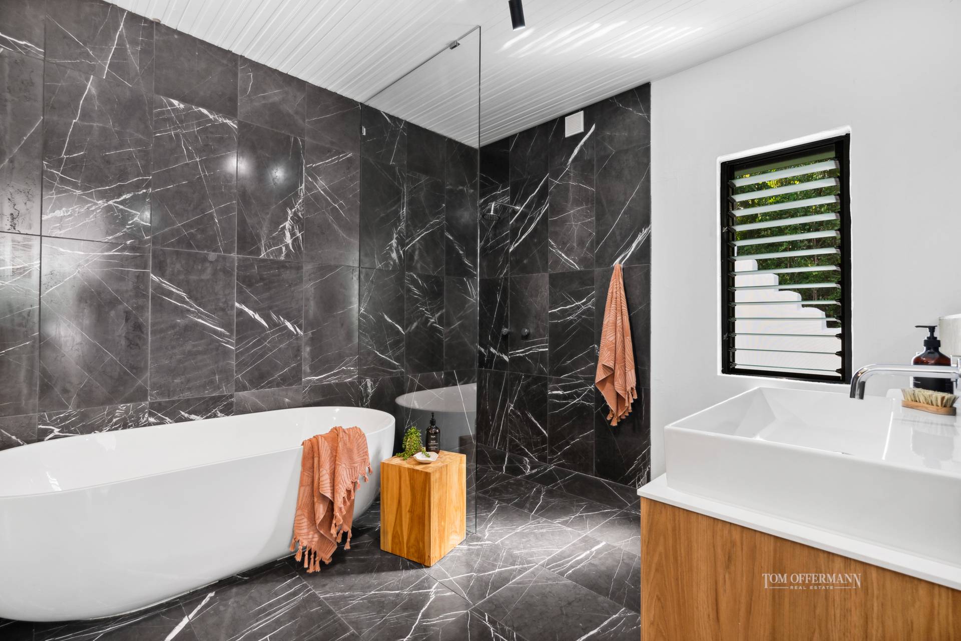 Admire plantation shutters, a wood burning fireplace, sumptuous white linen-covered sofas, rattan pendants and a serious bar custom built to cater for any celebratory occasion, especially on the oh-so-wide, white-floored terrace, and emboldens an immediate connection to nature's landscape. From a wide expanse of Noosa Heads, the lush rainforest back garden of terraced walkways to the creek where wallabies graze, to lawns and tiered sandstone-retained gardens with strelitzias and palms, this property is undoubtedly a slice of paradise.