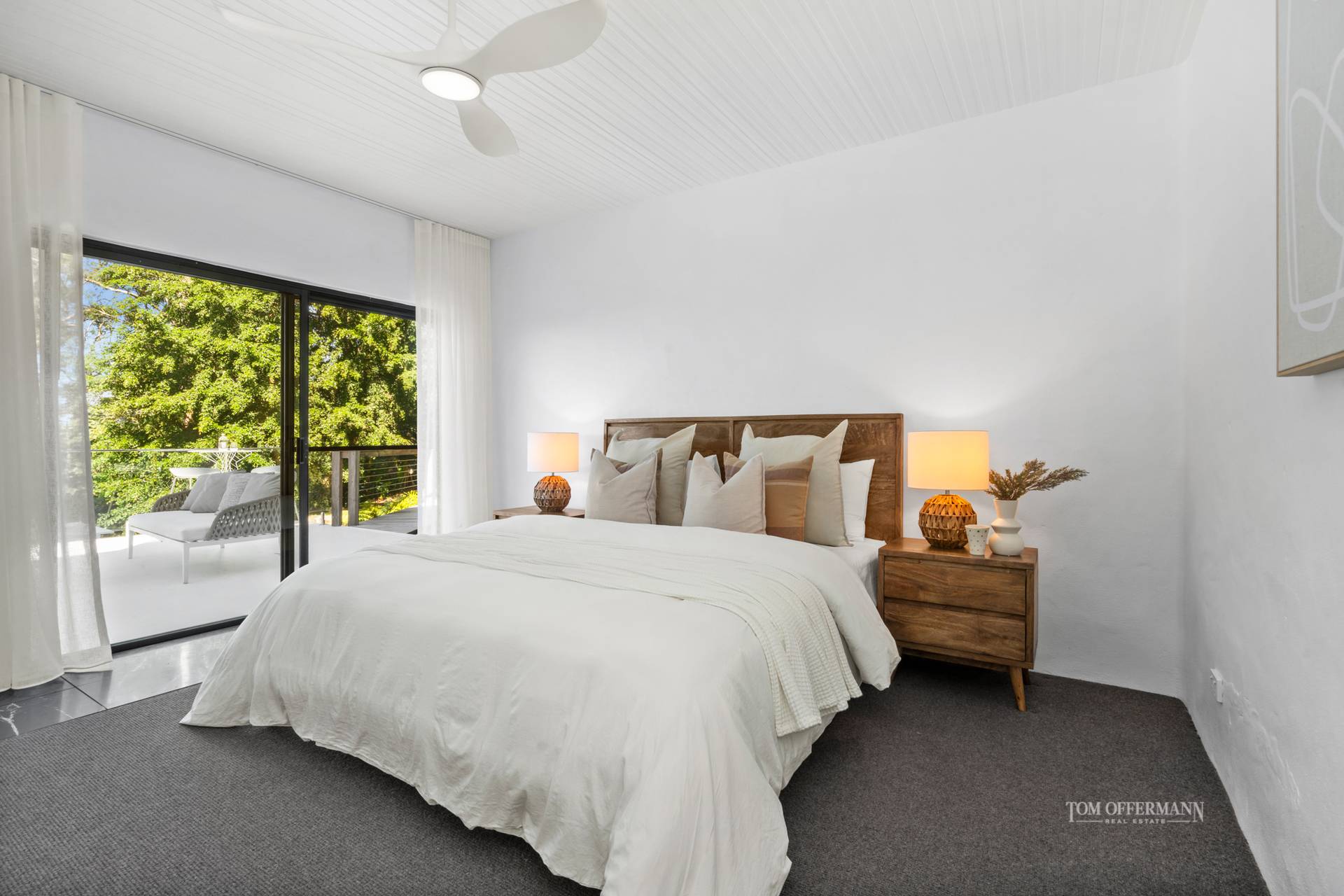 Allow the auto gates to slide away and reveal a pebbled courtyard, deep-set portico with statement pandanus, and side garden with tropical elephant ears and heliconias.
