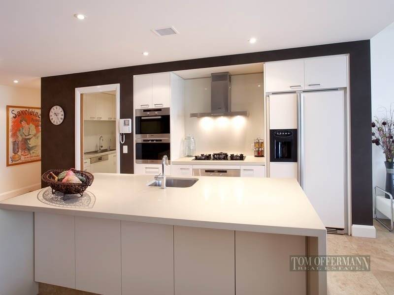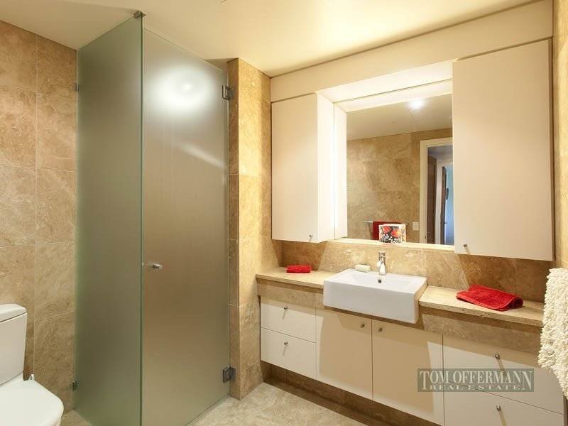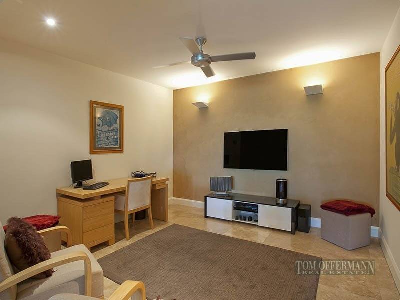 There is remote entry parking under the building and just a few steps to direct elevator access and an entry foyer servicing just two residences. Pedestrian keycard welcomes you into a tropical wonderland spanning the width of the building. A paved forecourt wraps the pool deck, stainless barbecue stations, wet bars and a very well equipped gym sure to enhance a healthy regime. Conical roof pavilions and dressed timbers capture the essence of the South Pacific, while sandstone pathways drift past the arms of coastal pandanus, tuckeroo and hedgerows of lush raphis palm. A raised spa edges some seventeen metres of the wet edge pool.