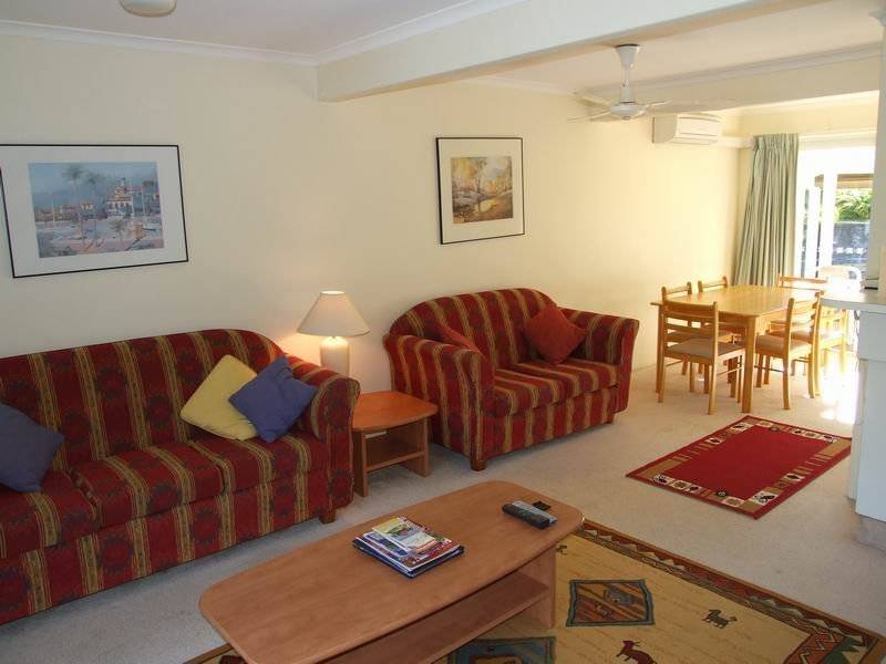 This townhouse is in good condition and is one of 21 placed in small groups around the gardens. It comes fully furnished and air-conditioned. The open plan living, laundry and extra w.c. are on the ground floor with the two bedrooms and bathroom on the upper level. Parking is undercover and directly behind the townhouse.