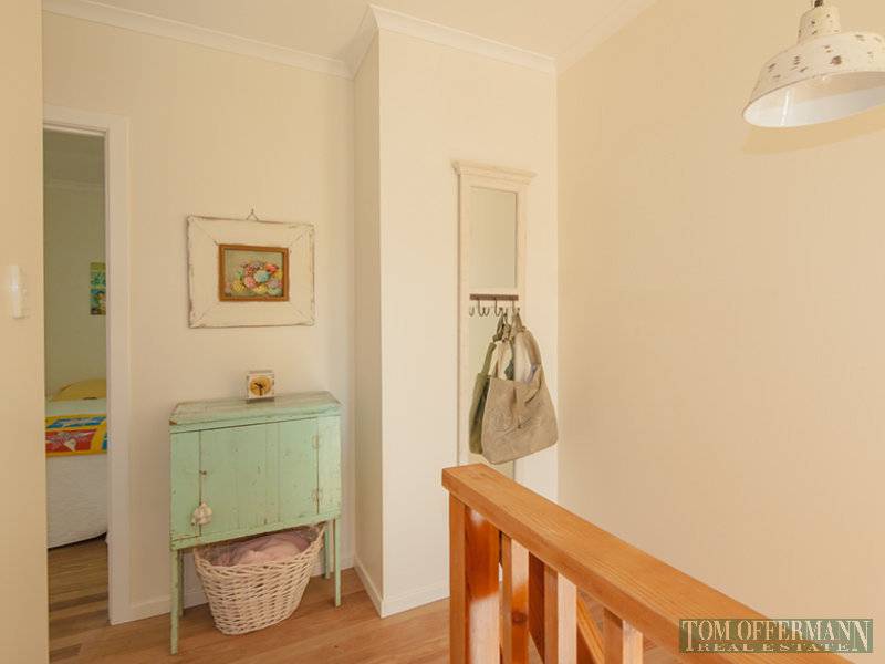 Timber stairs lead to the upper level, with three bedrooms and a bathroom. The master bedroom has it's own private balcony, overlooking the complex pool, plus ensuite access to the bathroom.