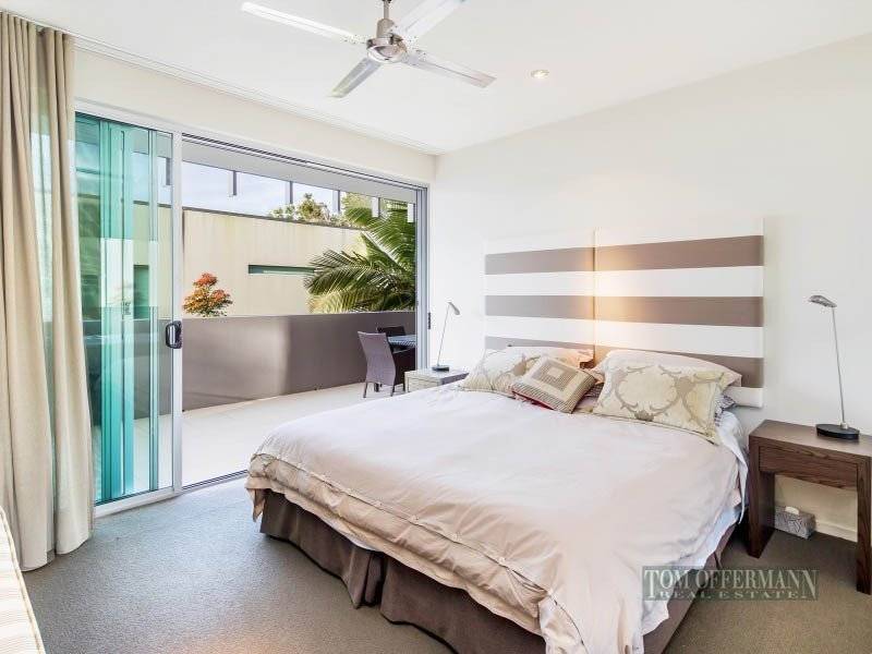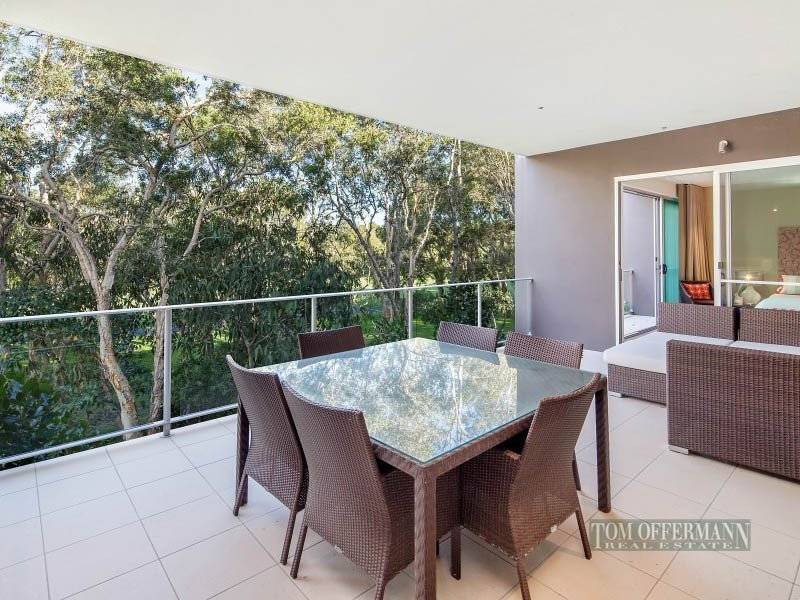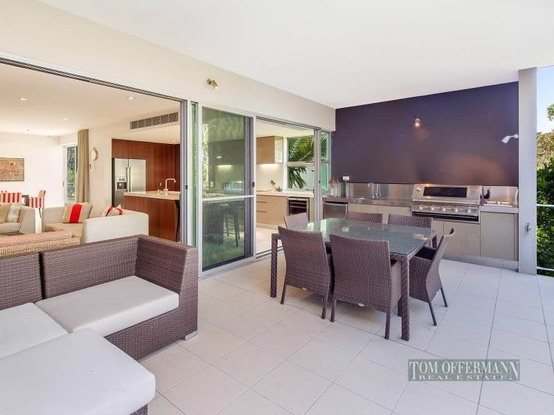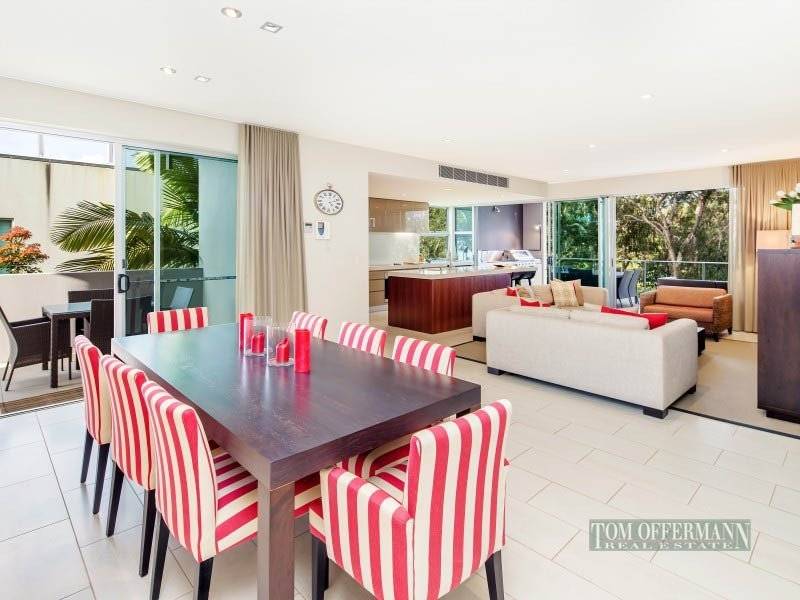 A walled courtyard entry cradles a sunlit pool and lush plantings of native gardenia, mini philodendron, eumundi eye and murraya edge a grassy side courtyard. There is security access to a basement garage, with this apartment benefiting from two adjacent car spaces and caged storage for the golf clubs, bikes and beach toys. Take the elevator or non slip tread staircase to the first floor. The privacy and serene nature of the apartment is complemented by pale tiled floors, high ceilings, large sliding doors connecting to an eastern covered balcony with built in barbecue station and a long northern balcony off the dining area and one of two double bedrooms. There is a full laundry room with cupboard space, bathroom with separate toilet room and a hallway linen press.