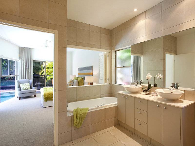 The main bedroom with walk in wardrobe runs down the length of the pool with direct access for a morning or moonlit dip. There are double vanities in the ensuite and a spa bath alongside a set of plantation shutters. Low on maintenance and high on resort facilities, life in Noosa Springs takes on a leisurely pace.