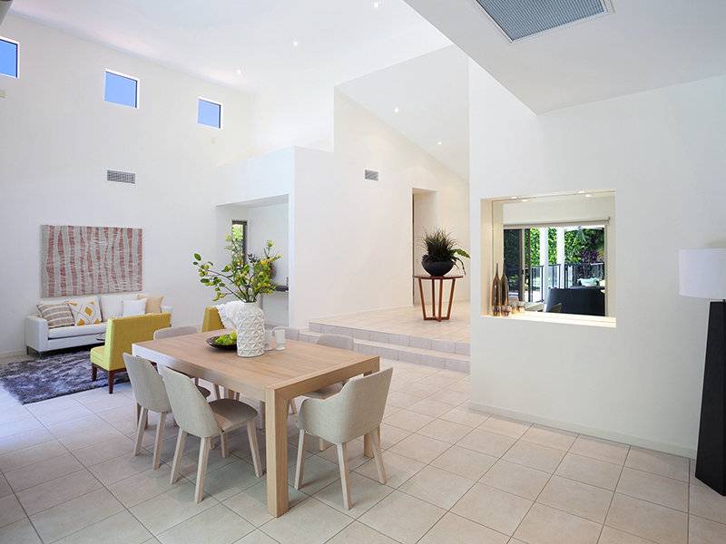 There is a whisper quiet nature to this freestanding gallery style residence. Elegant rhapis palm thrive in rocky garden beds and a freestanding studio with bathroom adjacent to the main entry accommodates guests with ease, or readily doubles as a private escape way from the main body of the house. A large pivoting door swings wide to a mirror wall vestibule and ceilings lift to a double height living room facing down the length of a centrally positioned pool and under roof terraces.