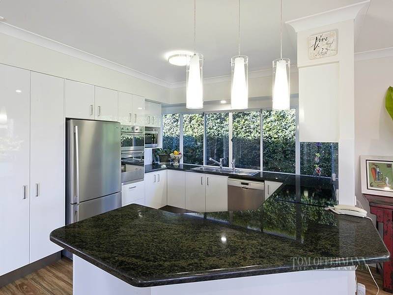 Pavers pass under the glass fencing of a freeform beach entry pool and stairs lead to a fixed timber jetty and boat cradle. A granite bench top kitchen has a full complement of Smeg quality appliances, with twin ovens, cook top and hot and cold on demand water. This robust residence strikes a formal pose to the landscaped street front and a tropical wonderland approach to the water.
