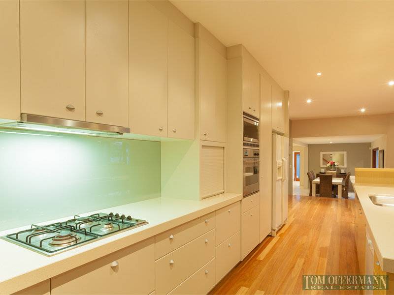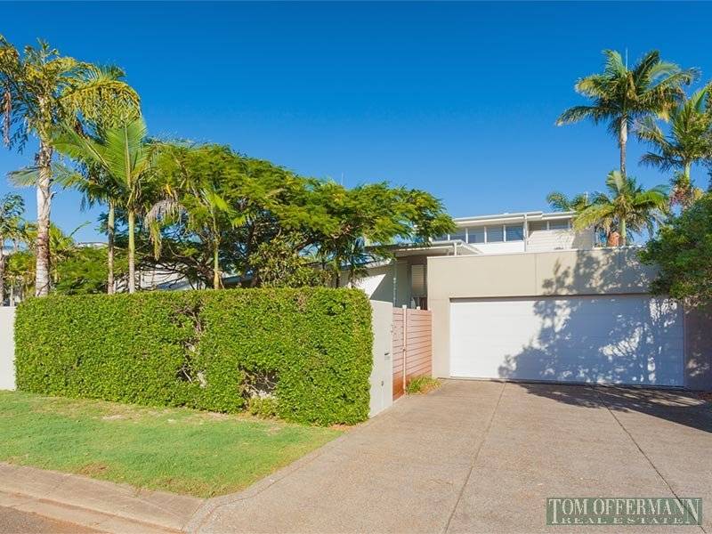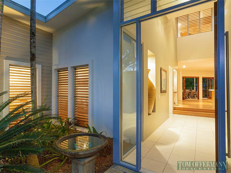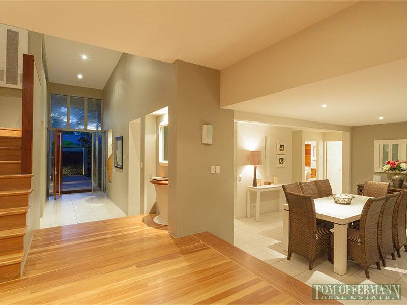 A beautiful Poinciana tree spreads across the entry courtyard, while rendered walls and trimmed hedgerows connect to a security pedestrian gate. A large lock up garage expands to incorporate extra roller storage for the bikes, stand up paddle boards and kayaks. A soft khaki exterior and crisp white trim highlight the lofty rooflines, while banks of glass louvres stepping around the formal entry catch light and a river breeze. Pale honey toned timber floors draw you past a courtyard bedroom and bathroom then lifts to a podium level living room where timber framed glass bi-fold doors peel away to the poolside deck. A well appointed kitchen with pale stone bench tops highlights a wall of pull out storage, gas hob and wall mounted oven. The run of a long sit up island servery drifts to a lounge area by the fireplace.