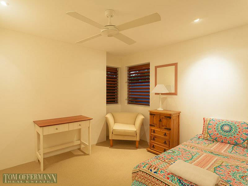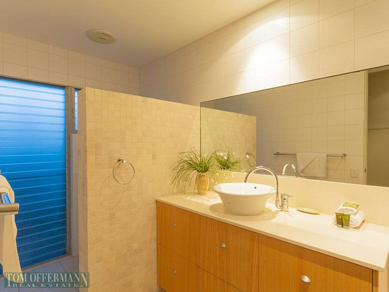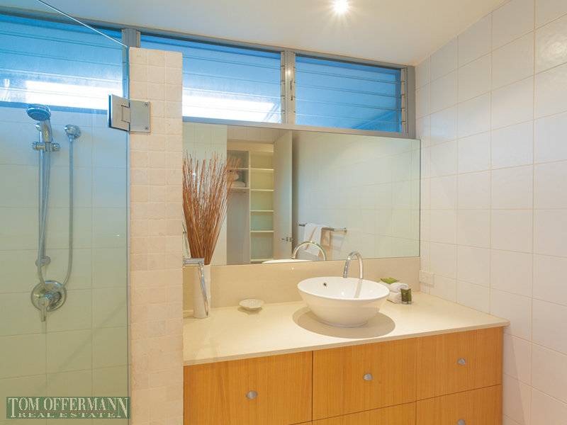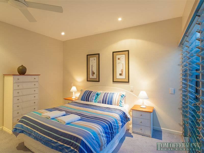 On the waterside garden level, tiled floors connect two bedrooms and a media room alongside the entry gardens. A bathroom opening on to an outside terrace doubles beautifully as a powder room. Square set ceilings and down lights accent the clean lines and soft colour scheme. Timber treads stairs lift and turn to a private main bedroom suite with sitting area, ensuite bathroom and a ships prow shaped balcony looking out over the water. Positioned right in the heart of Noosa Sound, it is a two minute stroll to the vibrant Quamby Place restaurant precinct and a level walk into Hastings Street and Noosa Main Beach.
