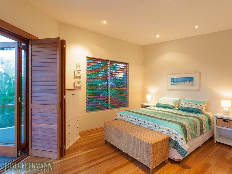 Designed to reward residents and guests with a secluded hideaway right on the protected waterways of Noosa Sound, this contemporary coastal home has a private approach to the end curve of the canal. Timber gates along one side boundary secure straight line access to a concrete boat ramp, sandy beach and timber planked fixed jetty. You can launch and retrieve your vessel with consummate ease.