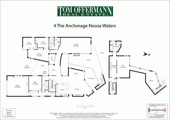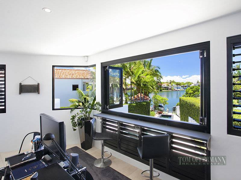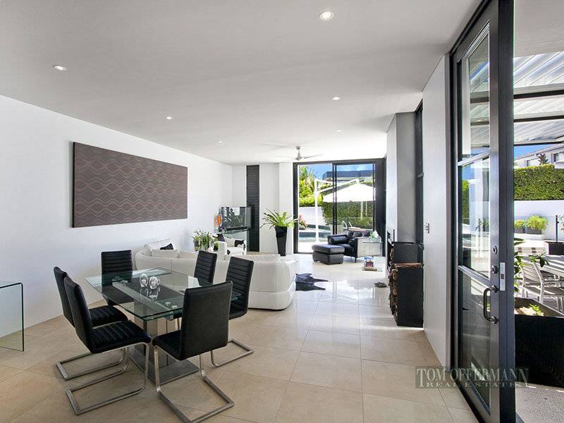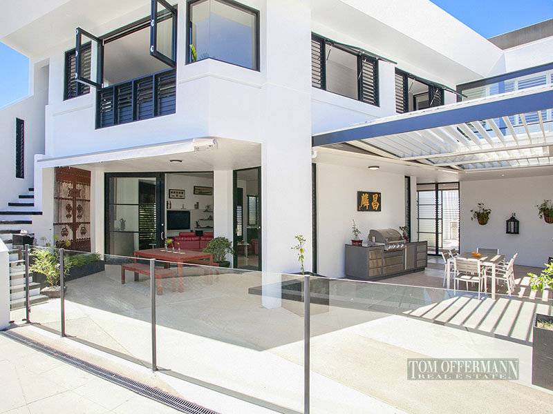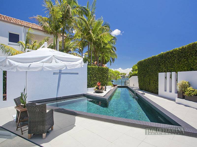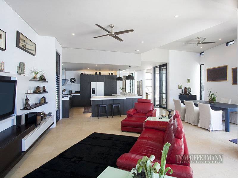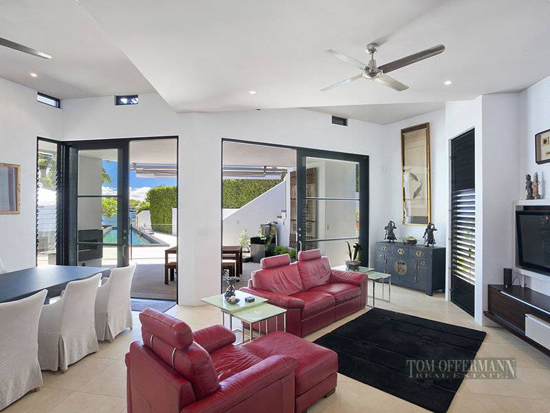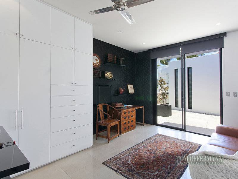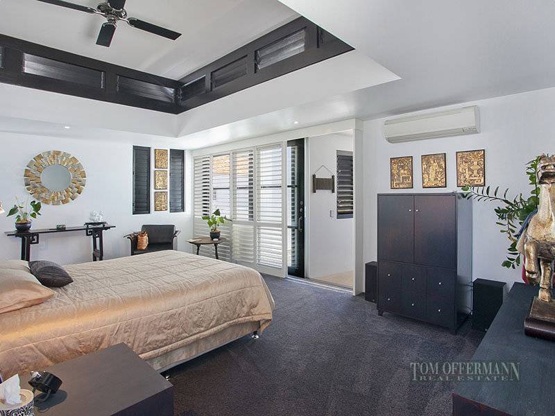 Built to take full advantage of its north facing waterfront block, the property curves around a central living area that opens out to an L shaped pool which leads down to the waterfront. The sumptuous master suite and adjoining studio enjoy views across Noosa Waters and occupies the entire top floor, with another three bedrooms downstairs.