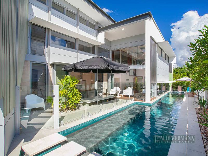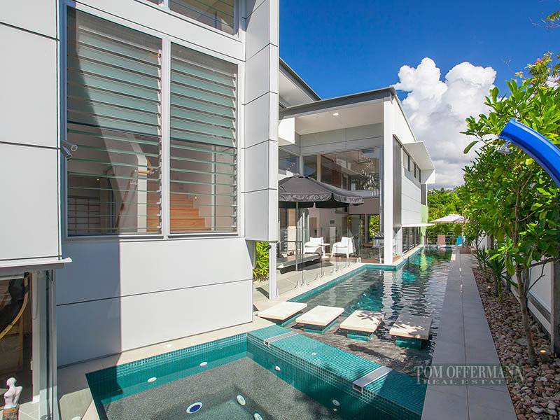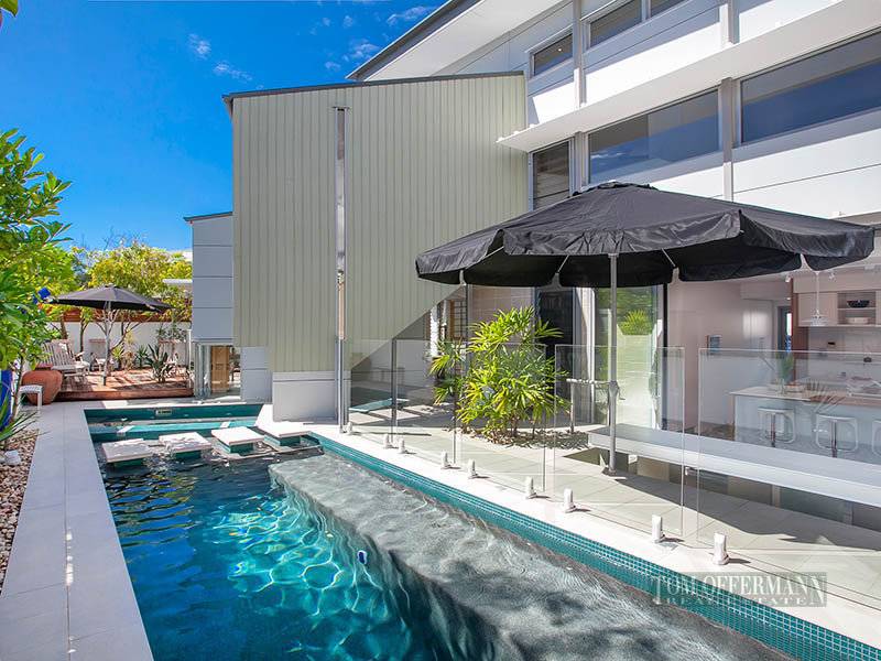 A northern aspect follows the track of sun right along the lengthy boundary, while podium poolside living areas and a magnificent main bedroom suite capture a leafy outlook over the lily pad lagoon. Separate automatic door garages are set back off an aggregate driveway, with internal access and a pedestrian gate swingsto a lush courtyard and the play of water in a reflection pond. Square set ceilings soar double height, light travels through lofted picture windows and large expanses of over-tall sliding and bi-fold glass doors and adjustable louvers catch and regulate a coastal breeze.