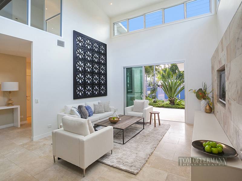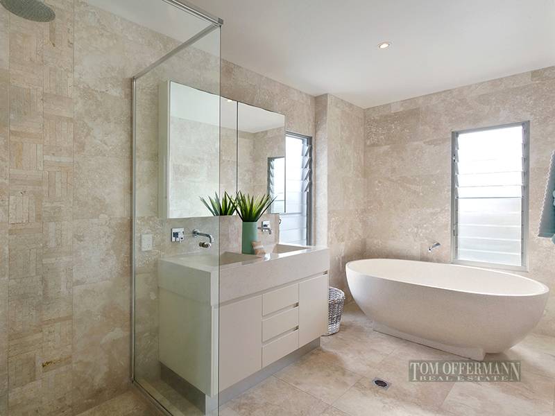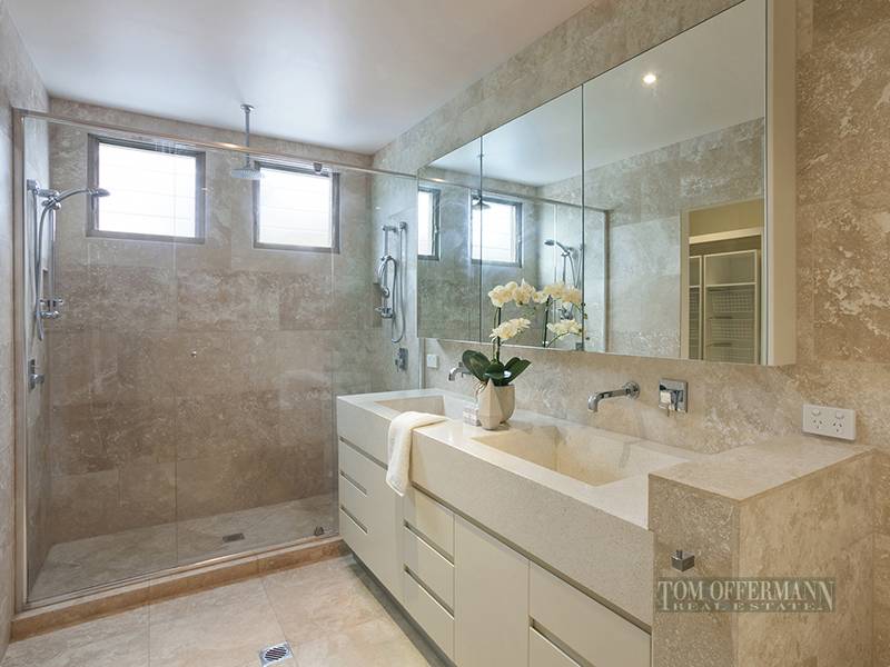 A downstairs master bedroom with generous walk in robe and ensuite is fitted with floor to ceiling glass louvres to let in light, breezes and views. All of the homes wet areas are easy care floor to ceiling Travertine. Fans, fully ducted air conditioning, loads of built in storage and smart wiring are all there for your convenience. Downstairs also houses a sunny office overlooking the enclosed front lawn, a tv/living room, laundry and powder room and there is internal access from the triple car garage.