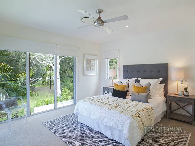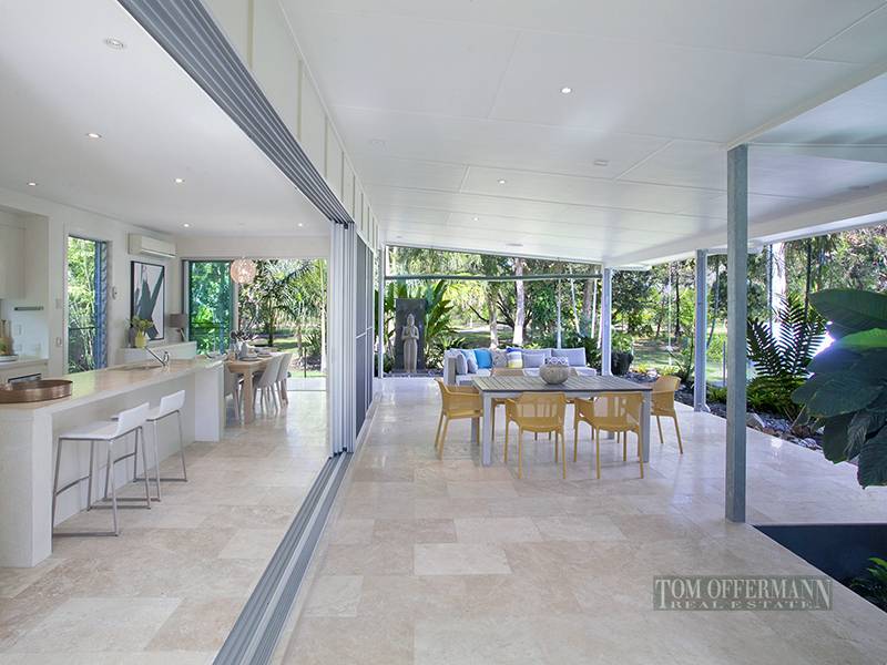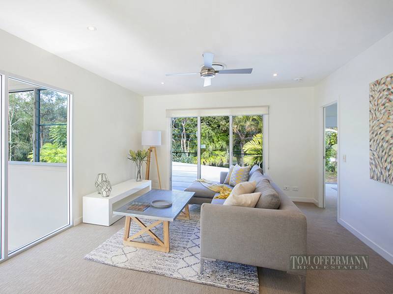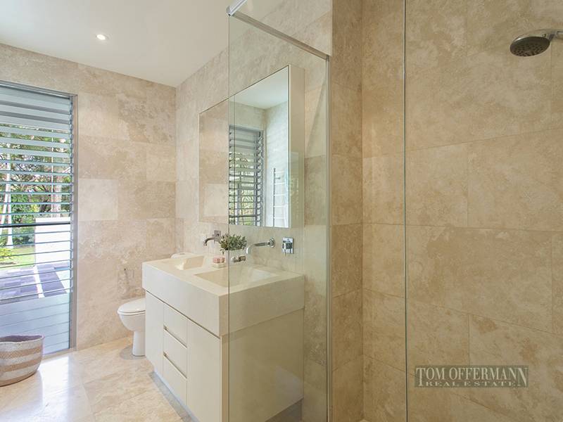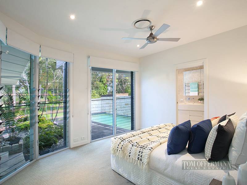 Upstairs there's another spacious master suite with walk through robe and ensuite with double sinks and showers. More floor to ceiling louvered windows let in breezes and natural light and look out across the trees to Weyba Creek. Another two double bedrooms and a bathroom with shower and designer bathtub complete the upper level.