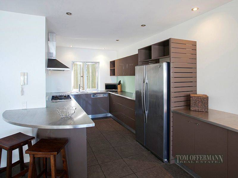 A powder room sits nearby and a laundry connects to paved pathways at the rear. Poolside timber decks are the perfect spot to stretch out with a sea breeze and avid surfers are able to check the surf conditions at the base of Lions Headland. Stainless steel benchtops curve and straighten along one wall in a large kitchen set up with Smeg gas hob and electric oven, dishwasher and stainless exhaust hood.