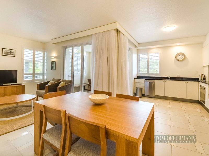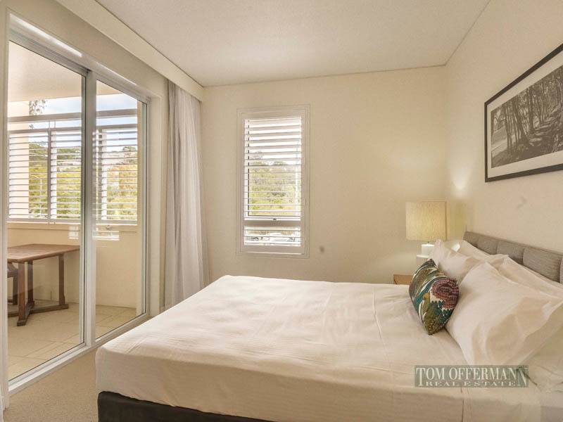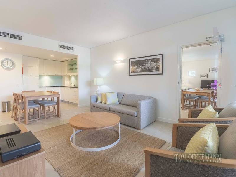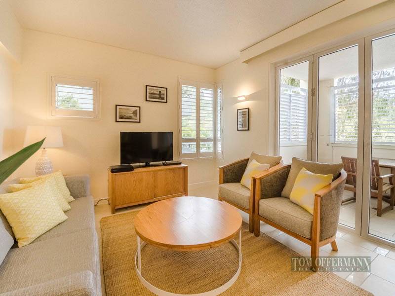 Privately positioned to the southeastern wing of the complex with elevator or one flight stairway access from secure basement parking, the units enjoy an outlook across parkland to the river. Bi-fold glass doors engage living areas and plantation shutter balconies regulate light and breeze. Both of the units have had some very stylish upgrading with floor to ceiling tiles and frosted glass shower. Designed to offer guests and their visitors a complete holiday experience, the moment you walk through the grounds a series of bridge linked pools fed by earthenware urns cater to young and old. Guests relax on sun lounges under the sway of palms and lush gardens.