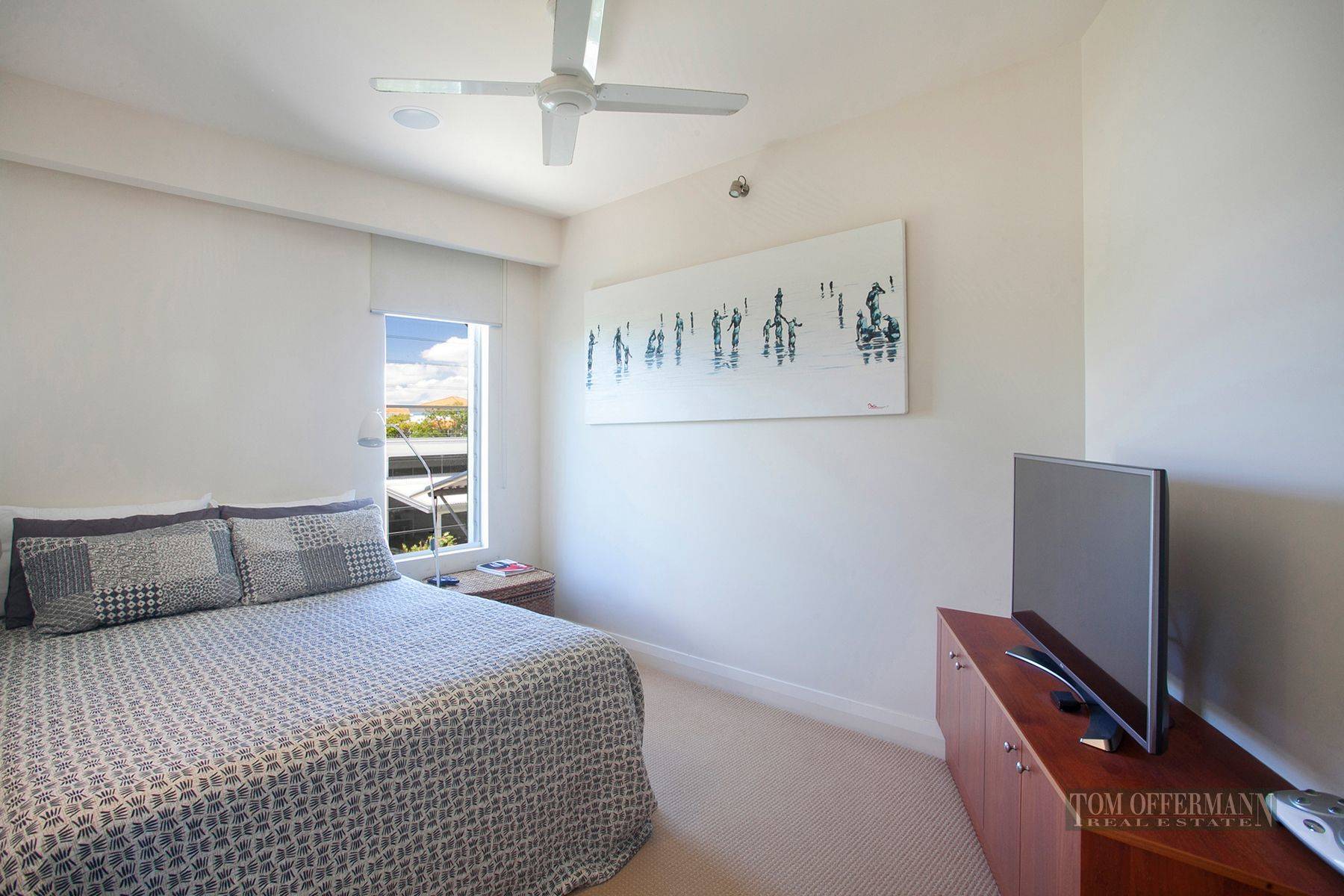 A whisper quiet elevator lifts to the penthouse and river views greet you at the front door. The timeless approach to material use and inimitable style of the designer flow in harmony with the river. Remote control slimline blinds filter the wonderful wash of natural light and the accent on soft white interiors highlights pale tiled floors and powder coated bi-fold doors. Linking a large flyover roof patio, glass topped parapet walls wrap around the open elevation. Concertina plantation doors frame a large main bedroom suite with window lined private lounge and nib wall separation to a sleek double vanity ensuite bathroom. A frosted glass door swings to a western juliette balcony. Two further double bedrooms and main bathroom are privately angled off the main entry.