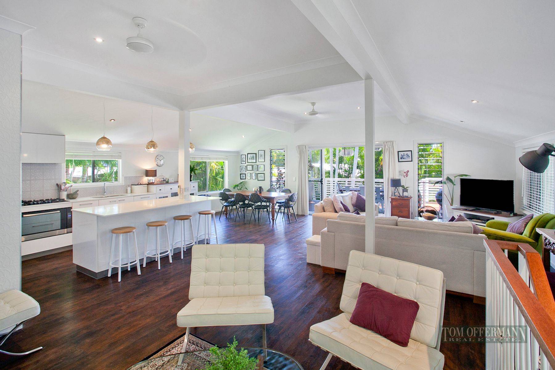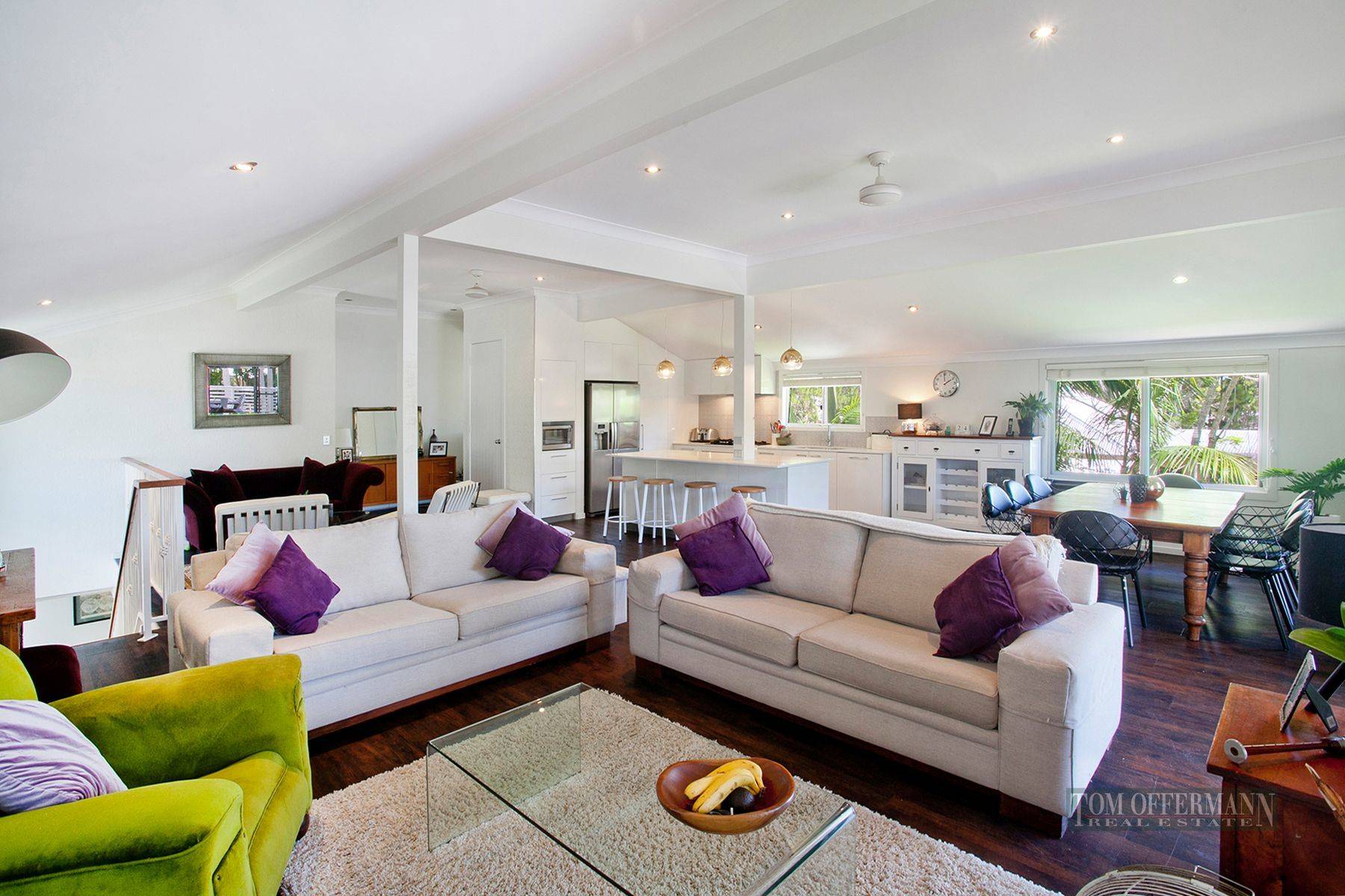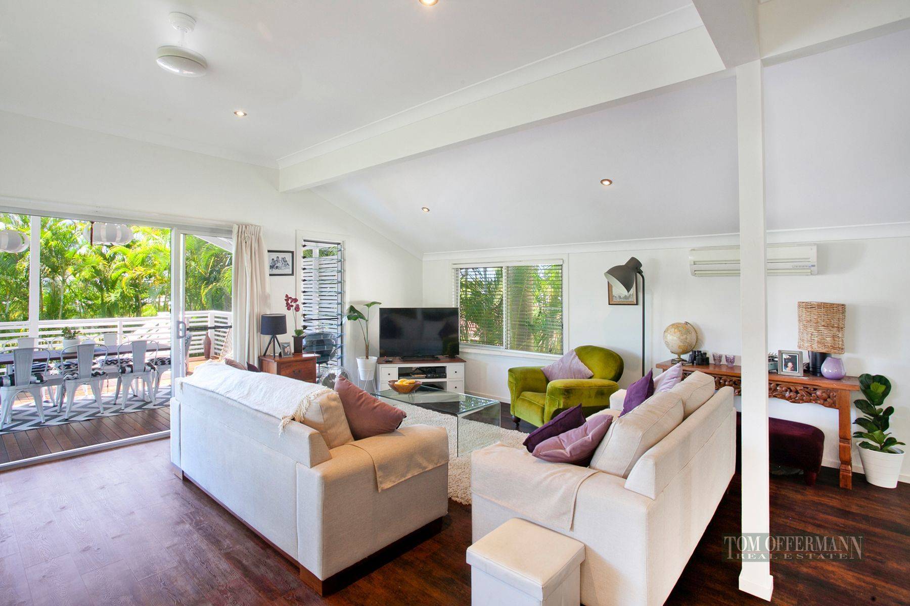 The deep tone of hardy vinyl floors contrasts a crisp white on white colour scheme and sliding doors engage a width of the house timber deck with soaring peaked roof and open staircase to the grounds. Peaceful, private and ideal for entertaining on any scale, this well located Tewantin beauty will capture your heart.