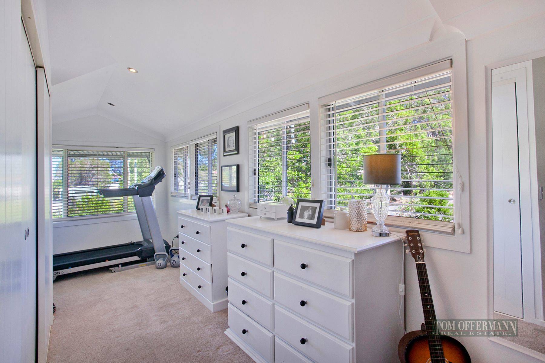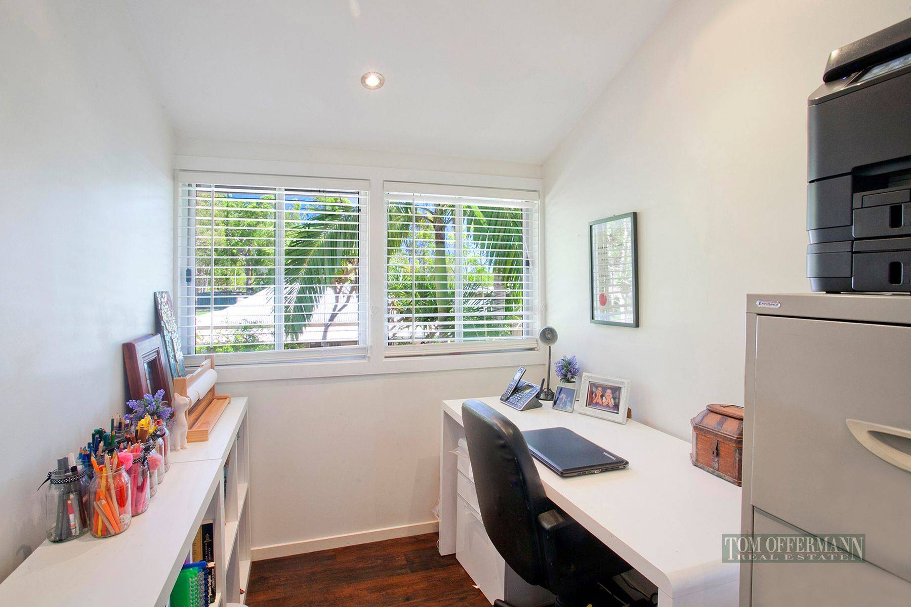 A wrought iron railing accents the rich glow of a New Guinea Rosewood staircase to an upper level that performs equally as a private parent's retreat. There is a powder room and secluded office on the approach to a delightfully generous main bedroom with double vanity bathroom and built in wardrobes in the adjoining dressing room. With wall free living and dining under lofty down lit ceilings, pendant lights place the focus on a stylishly prepared island kitchen with stone benches, tiled splash back, multi- point gas hob, twin sinks, soft close drawers, walk in pantry, under bench oven and dishwasher.
