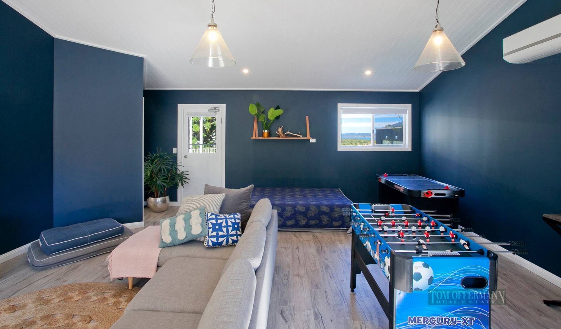 The focus of the substantial alfresco area is of course the 8.5m pool and the covered area with a stainless steel Matador outdoor kitchen barbeque and fridge, offering another entertaining option, but this time with a huge bonus. It abuts the very generous games' zone where hanging-out watching television and playing arcade-style games is de rigueur. But big boys note: there's plenty of room for your bar and a snooker table.