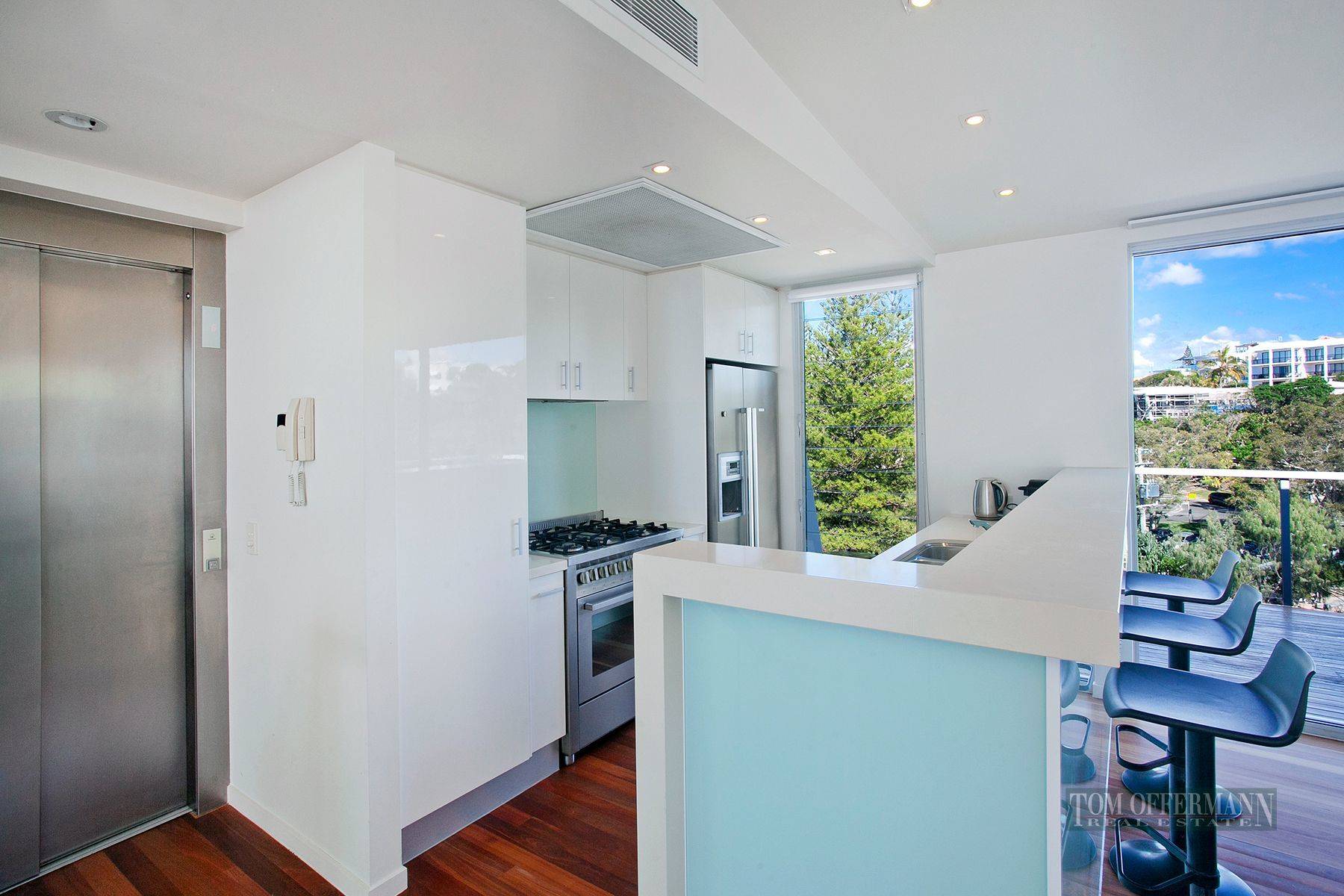 Taking apartment living to new heights is a 4-storey duplex. Arrive and the immediate reaction is to take the lift to the main living spaces, head up a few stairs to the roof top deck, then sigh. What a panorama. The Pacific Ocean and surf breaks out front, Noosa National Park and Lions Head to the left and sweeping south is a gulls-eye view to Coolum, Mooloolaba and beyond.