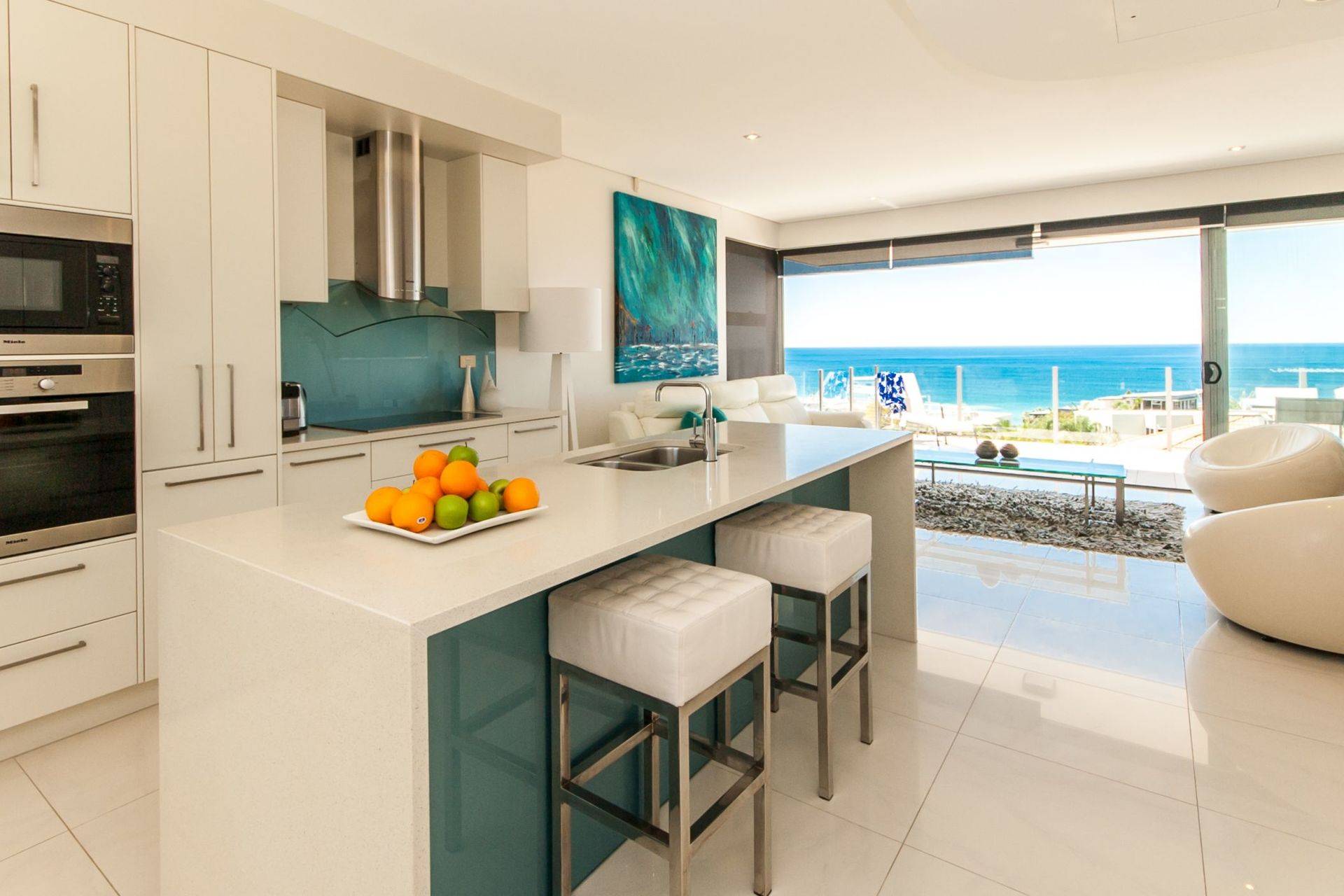 The views through the walls of glass sliding stacker doors front and back. A flow through design enables a choice of sitting on the balcony facing the ocean, or the balcony facing the hinterland with the kitchen in between.