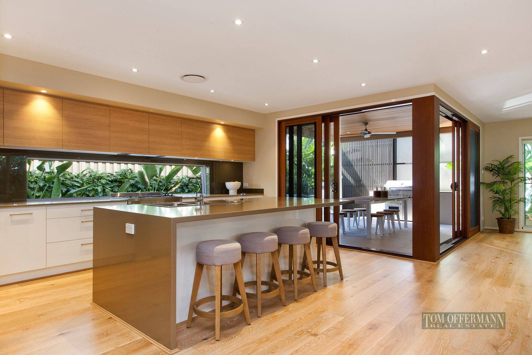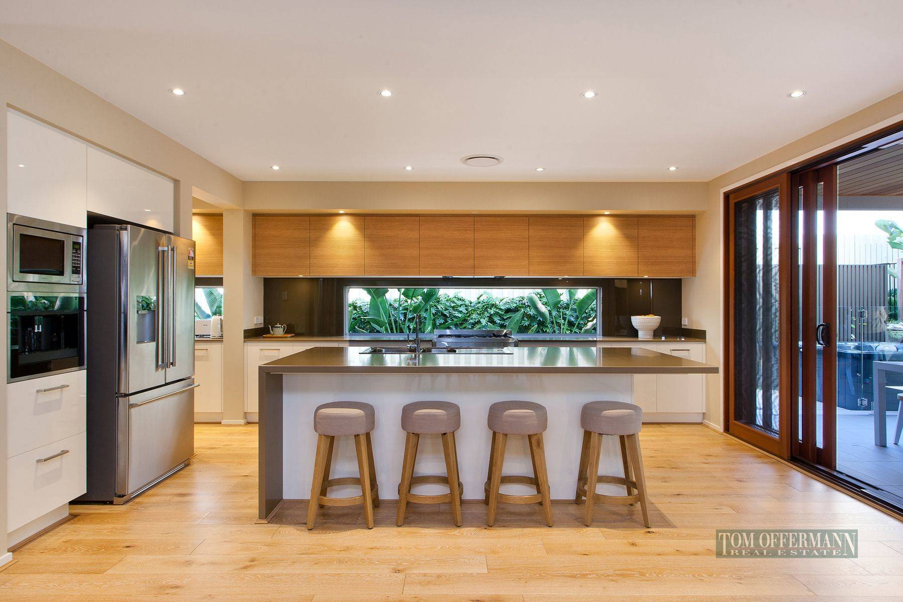 The kitchen and the butler's pantry with timber cabinetry are striking. Quantum quartz designer bench tops, Italian brand Teknika cookware, dishwasher and integrated coffee machine, and an extended glass splash-back like no other, infact a living image of the garden in a frame.