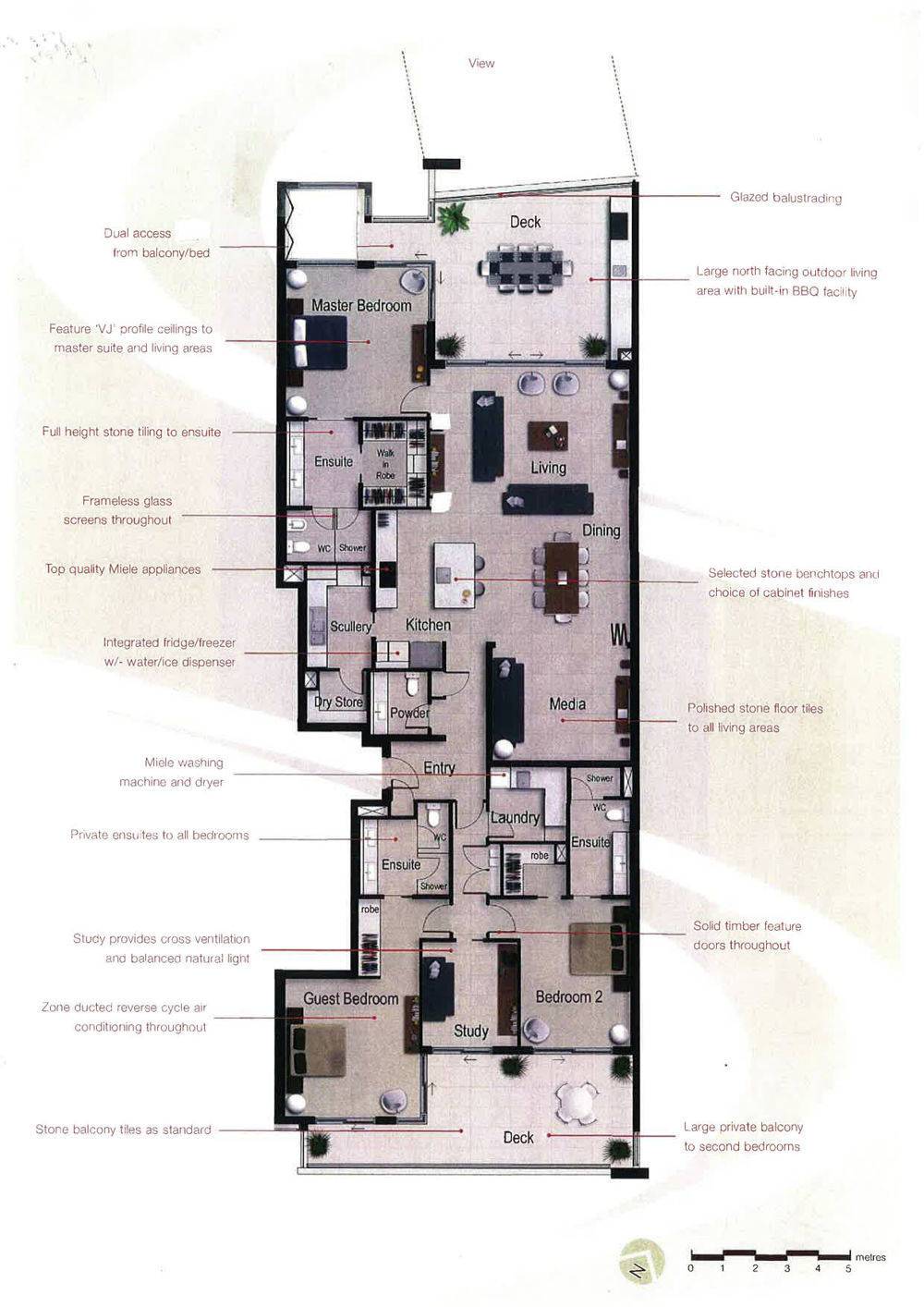 Bedrooms two and three have ensuite bathrooms; the office/study has wall-to-wall built-ins; and the three rooms each have sliding doors onto the 25m2 south-facing balcony, which overlooks lush gardens and pools.