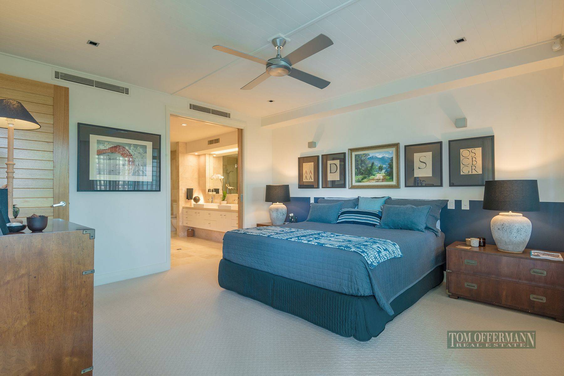 The grand master suite is reminiscent of a 5-star hotel: walk-in robe, bathroom, bidet, sliding doors to the 38m2 northerly terrace, louvred windows entice breezes plus soothing sounds are courtesy of the ocean.