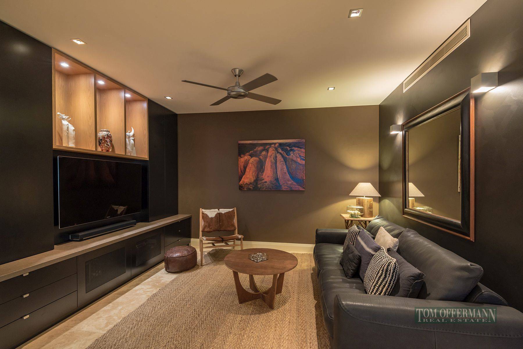 Striking an imposing presence in the tech-savvy media room, is a custom designed and integrated floor-to-ceiling, wall-to-wall cabinet with American oak accents. It houses the integrated television and Sonos sound system. The moody wall colour and solid timber paneled stacker doors close off any noise to the living spaces.