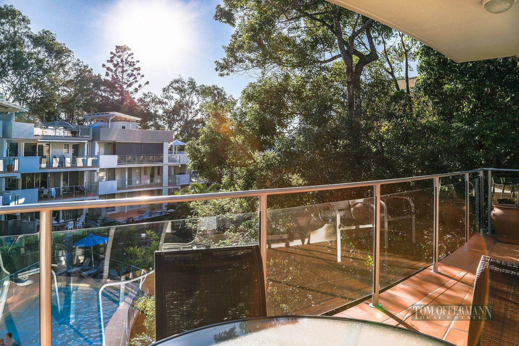 Love the enjoyment of a serene Little Cove Beach across the zebra crossing, the convenience of the Noosa National Park and Hastings Street only a short stroll away? Then you should look at this centrally positioned mid floor 2 bedroom 2 bathroom apartment. There are 3 balconies. The main one wraps around the front deck overlooking the pool. The other 2 attached to the bedrooms, adjoin the rainforest. The kitchen servery opens onto the front deck.