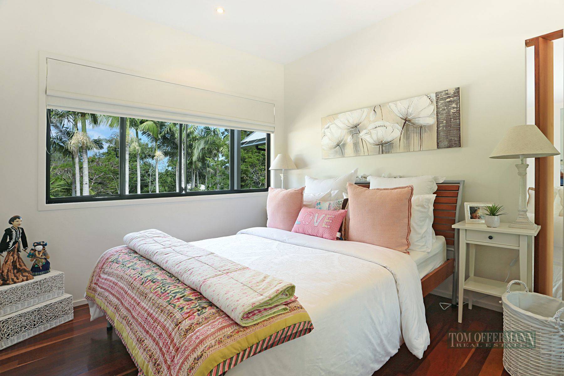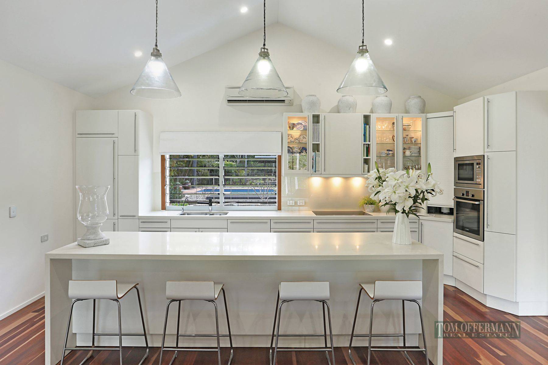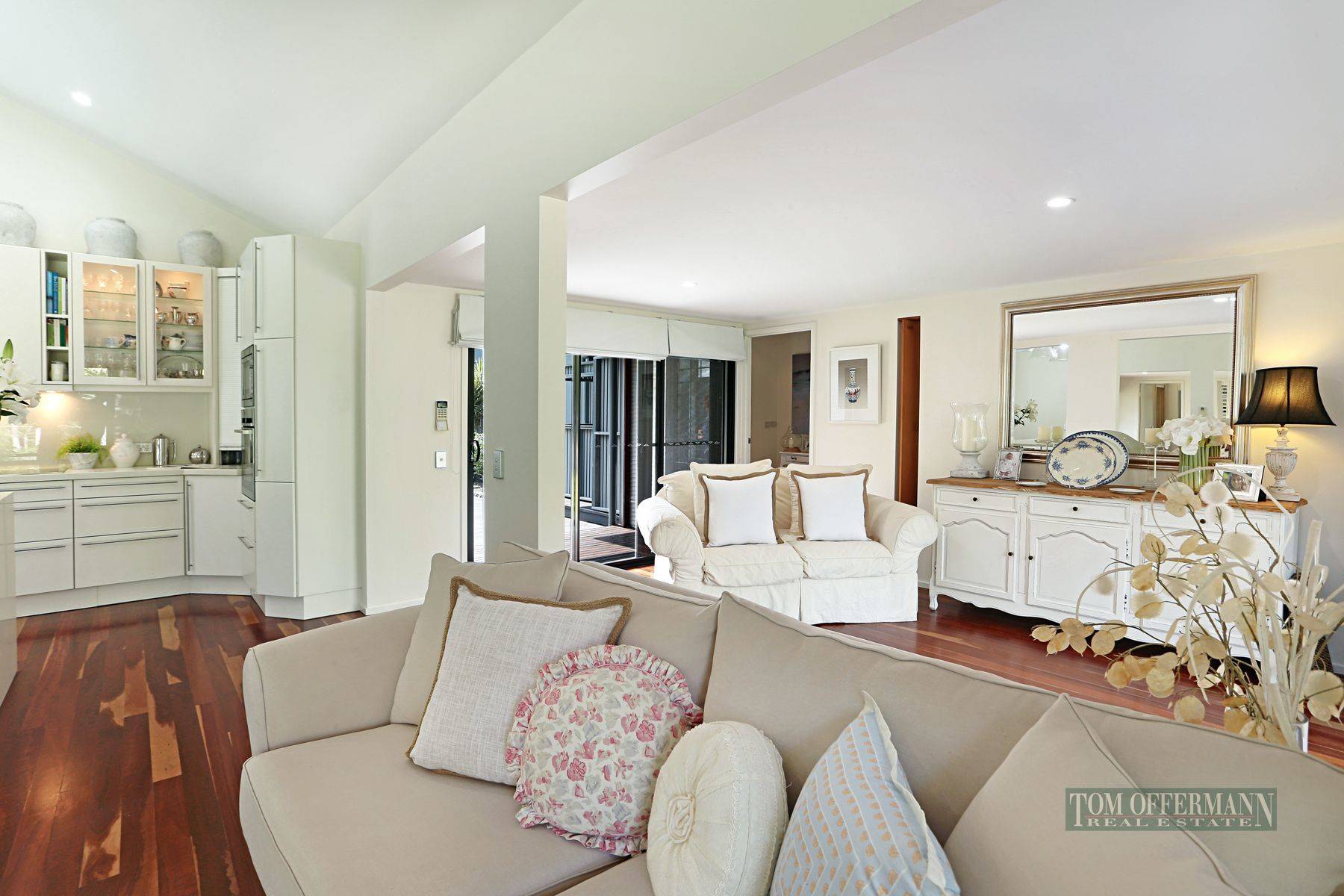 Lofty Alexandra palm edge a long concrete drive making its way through tropical gardens to a very accommodating barn like garage that complements the linear profile of the dwelling. Sympathetic upgrades over the last five years have added little luxuries we've come to expect. A glass door swings to a formal entry, while to one shoulder a freestanding pavilion offers versatility as a studio for the artfully inclined and slightly removed guest accommodation. Function and form deliver a harmonious symphony of gleaming Sydney blue gum floors under lofty ceilings, bedroom wings shouldering easy flow living and that wonderful connection with nature.