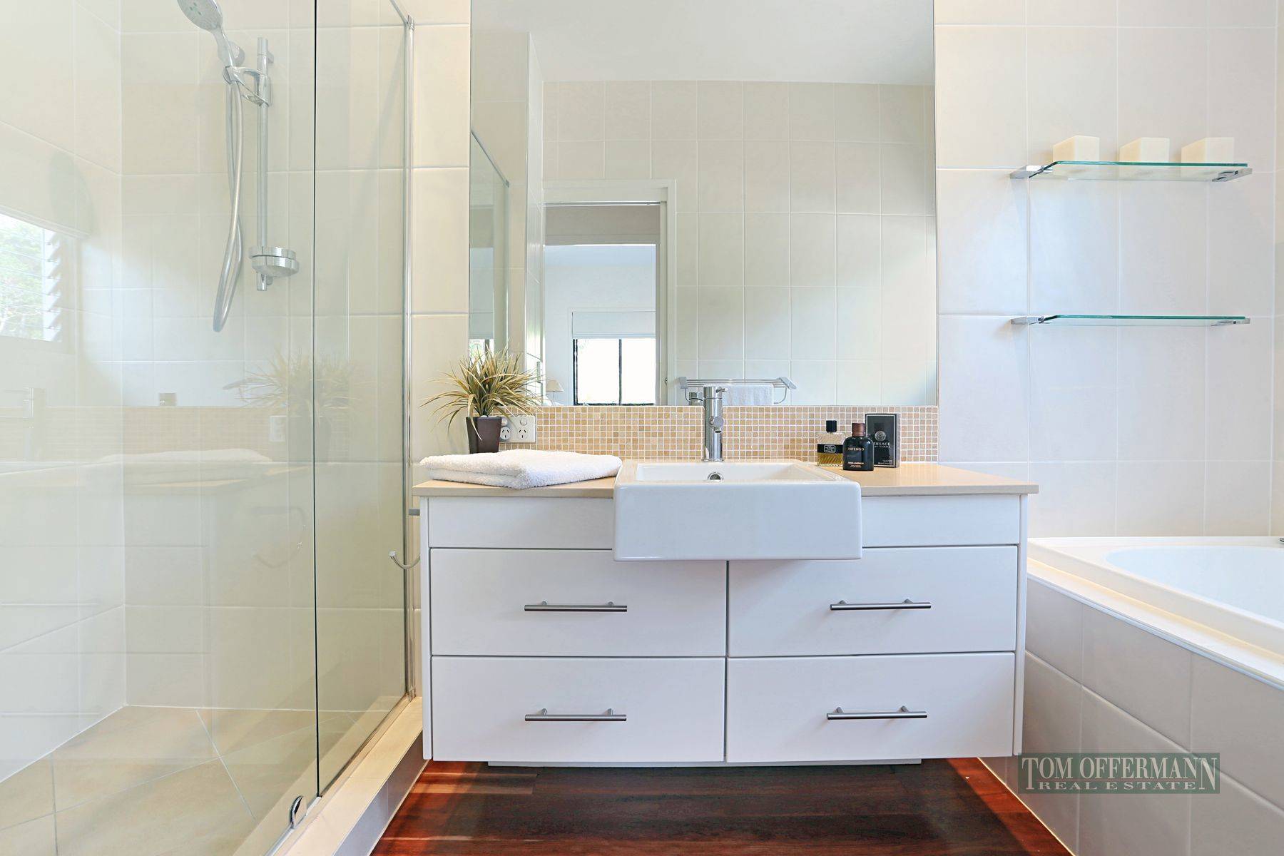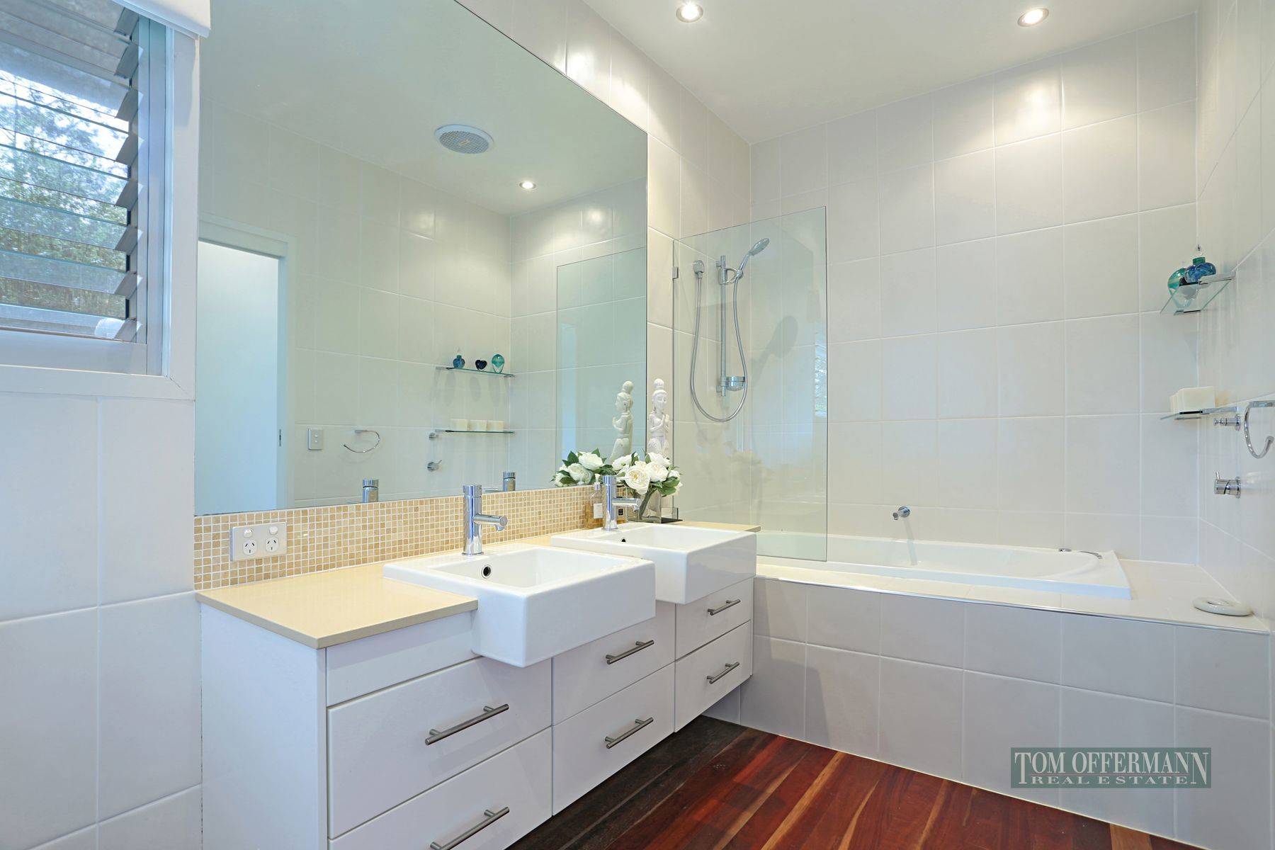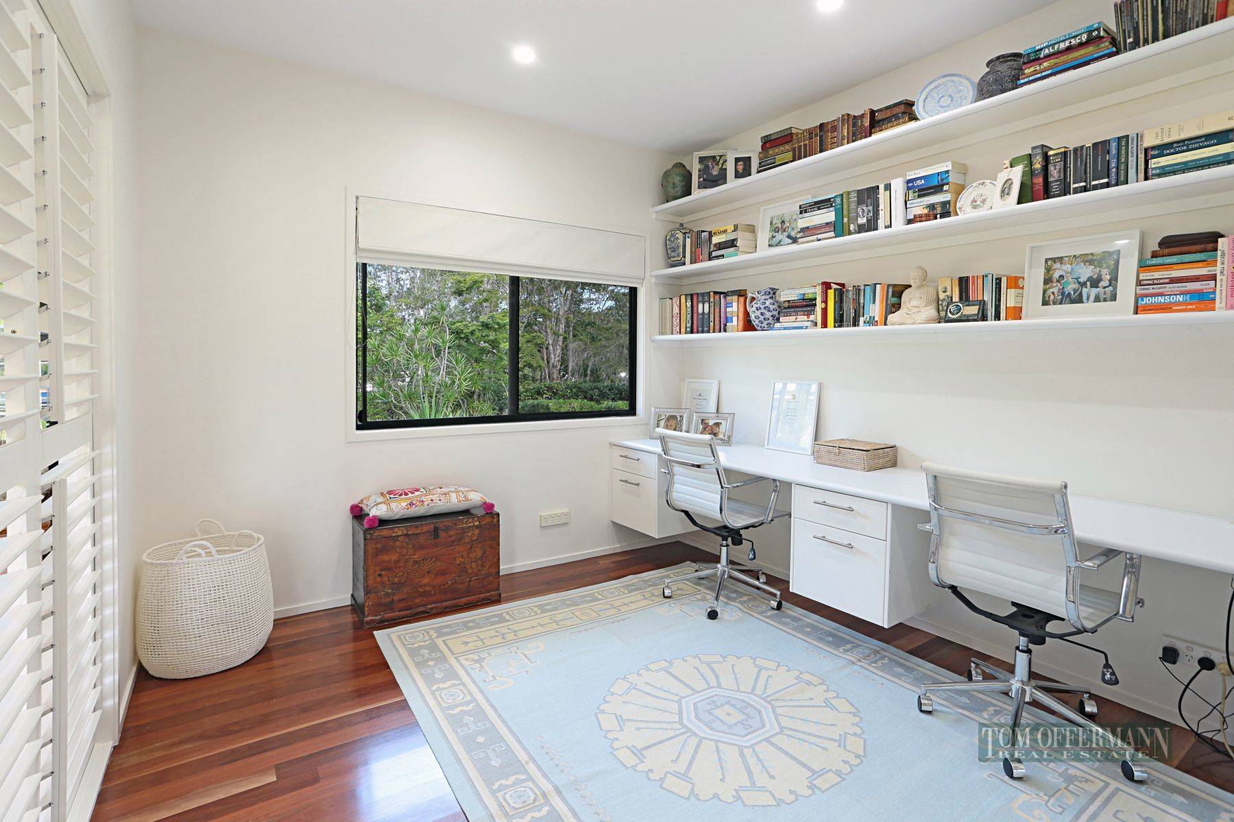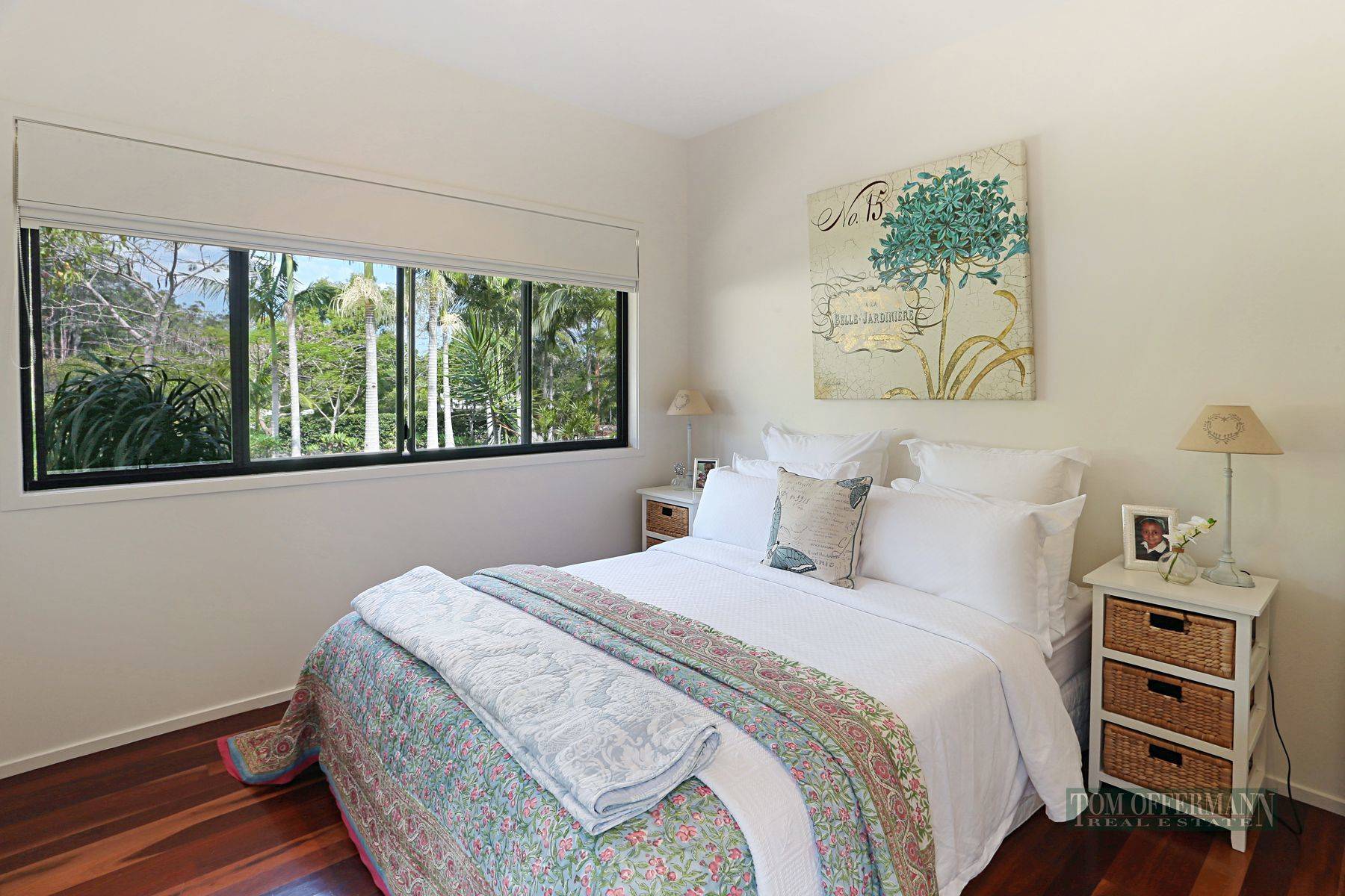 Lofty Alexandra palm edge a long concrete drive making its way through tropical gardens to a very accommodating barn like garage that complements the linear profile of the dwelling. Sympathetic upgrades over the last five years have added little luxuries we've come to expect. A glass door swings to a formal entry, while to one shoulder a freestanding pavilion offers versatility as a studio for the artfully inclined and slightly removed guest accommodation. Function and form deliver a harmonious symphony of gleaming Sydney blue gum floors under lofty ceilings, bedroom wings shouldering easy flow living and that wonderful connection with nature.