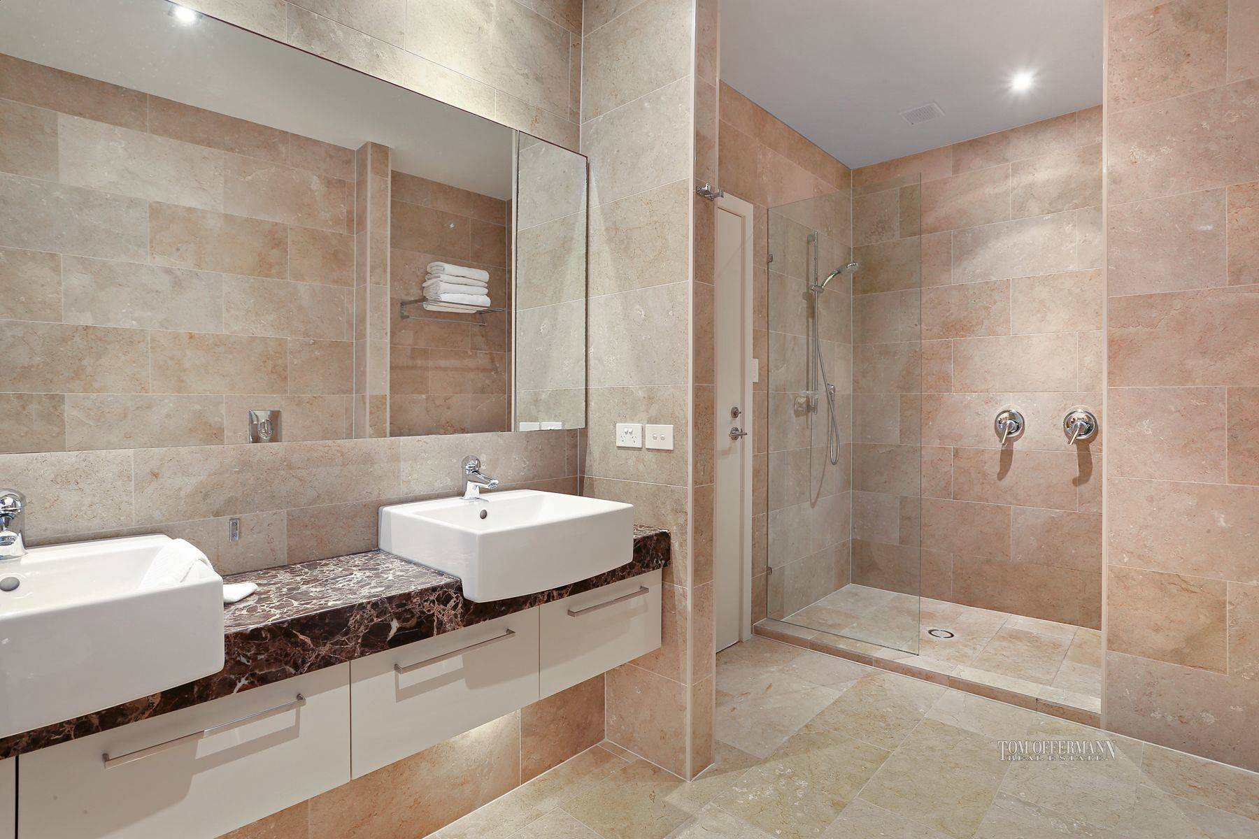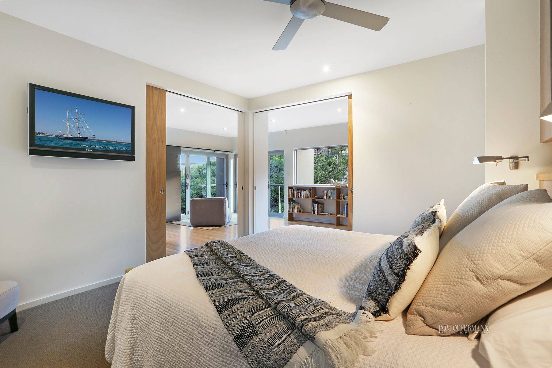 Upstairs is truly remarkable. Textures both slick and sumptuous, such as Tasmanian oak floors, are most apparent in the grand master suite, which is the size of a very luxurious one-bedroomed apartment. And yes, there is a living area as well as a kitchenette, walk-through robe, bathroom, study/office and balconies. All large, just like the ocean views. Another two bedrooms and a bathroom add largesse to the upper level.