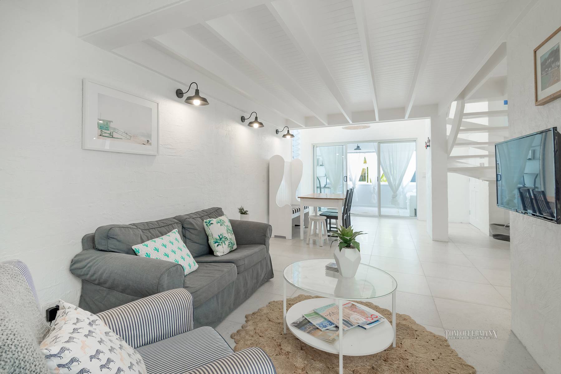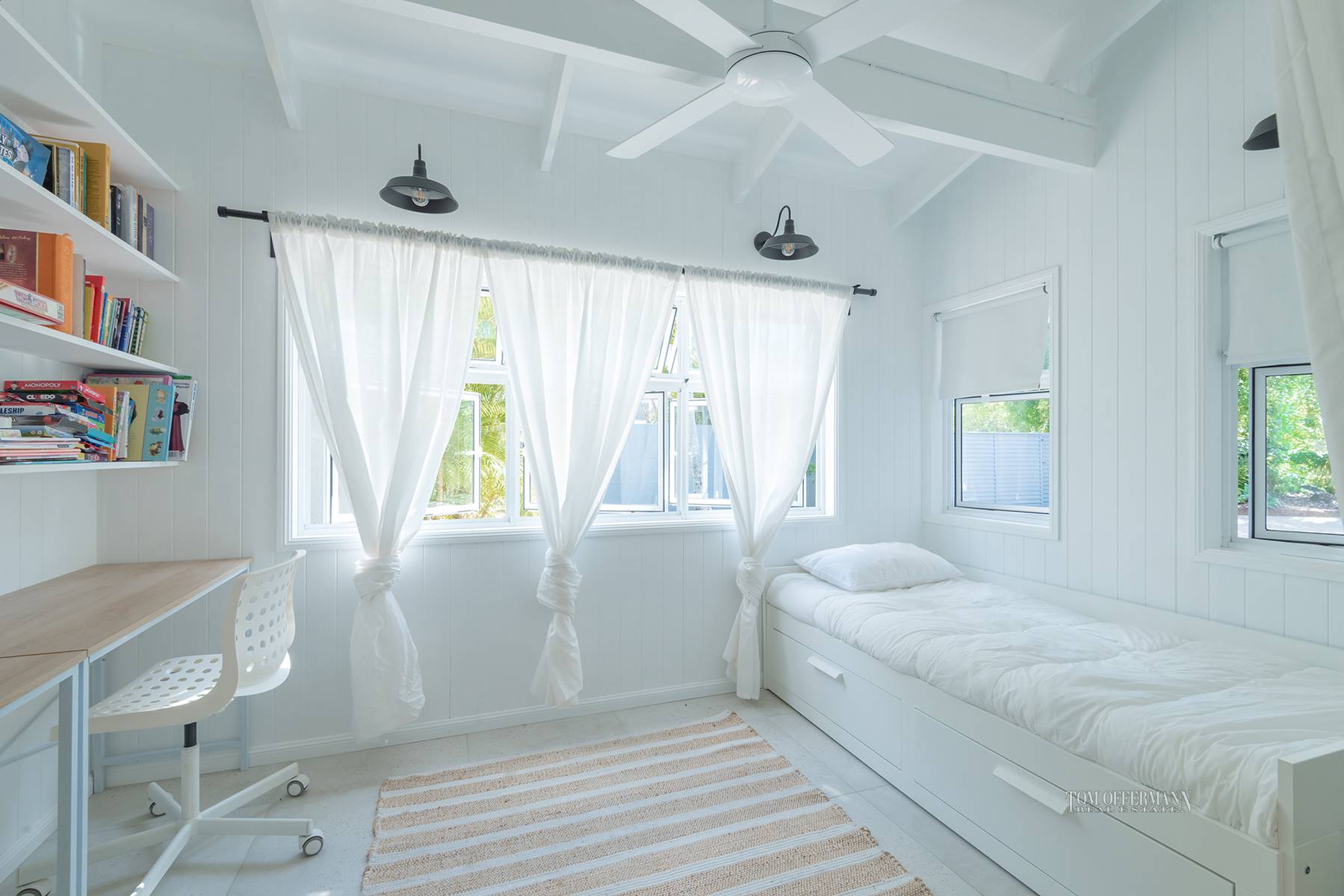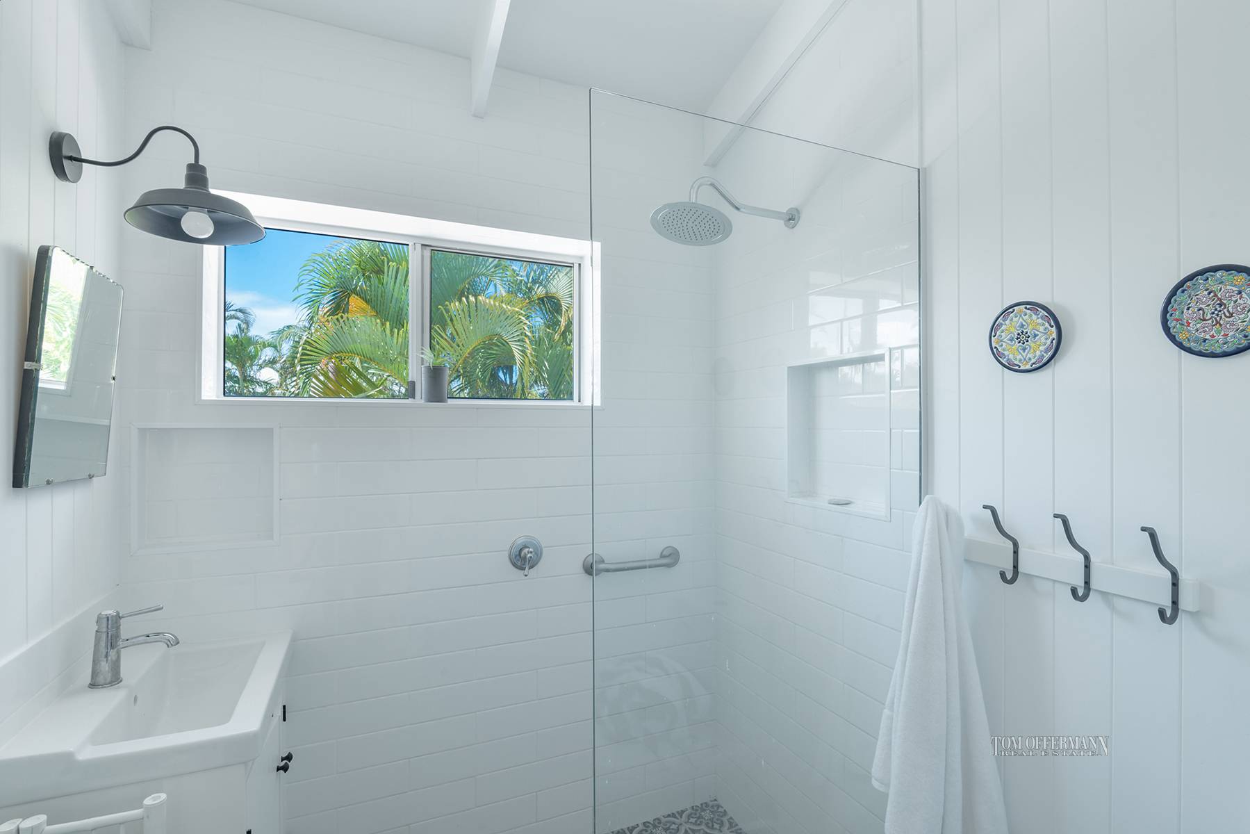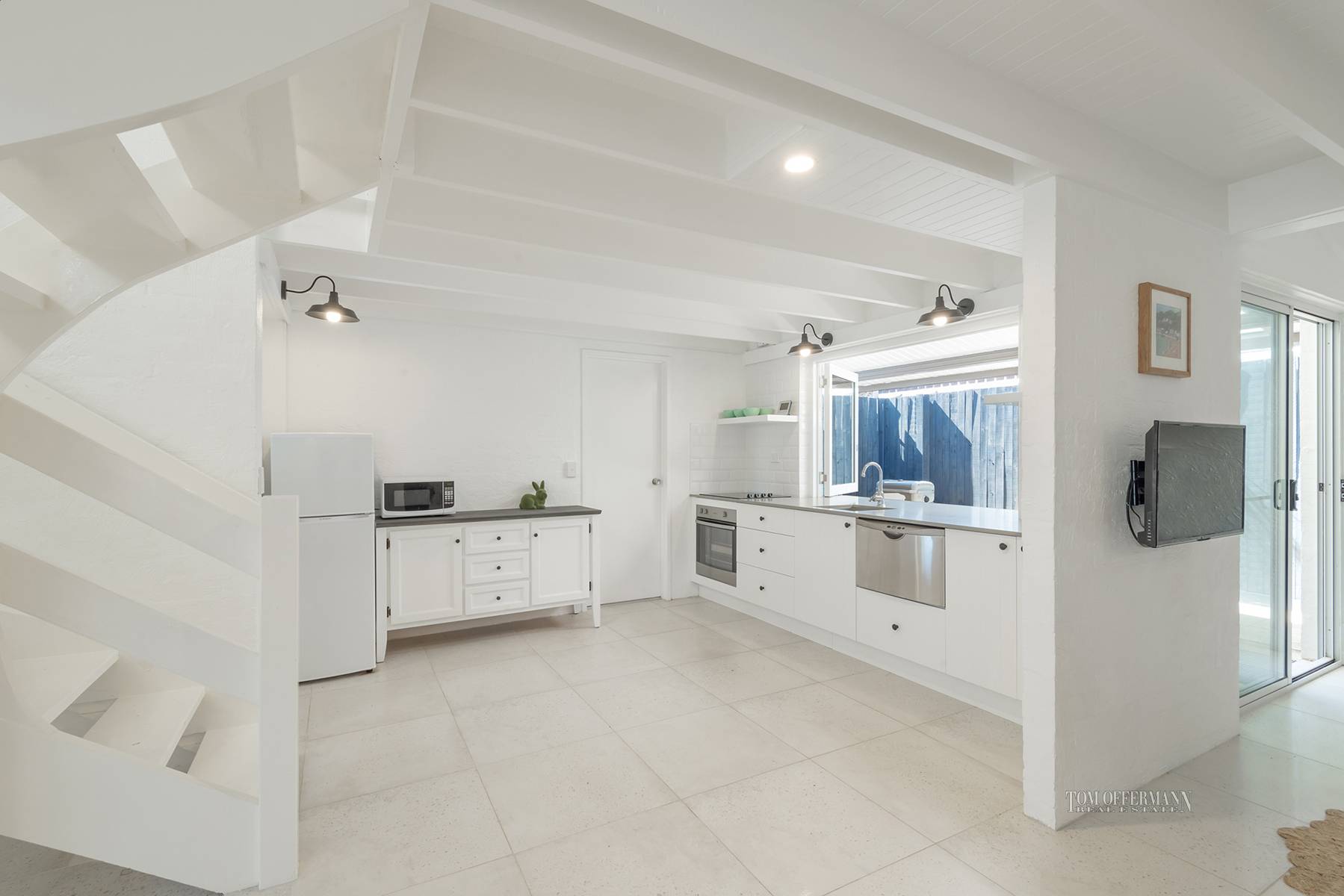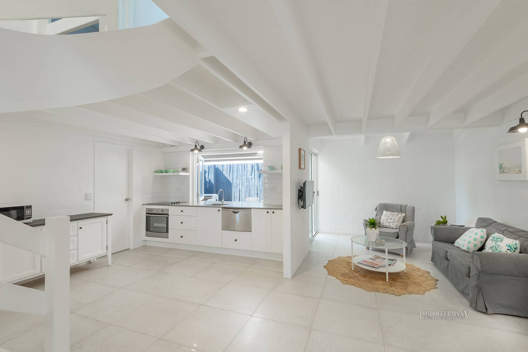The interior make-over is brilliant - cool classy white paintwork and terrazzo-look tiles are used to great effect giving a chic beachy ambience throughout. The contemporised kitchen has a servery opening out to the covered patio, the courtyard extends almost the length of the western side, and the laundry has bathroom facilities.