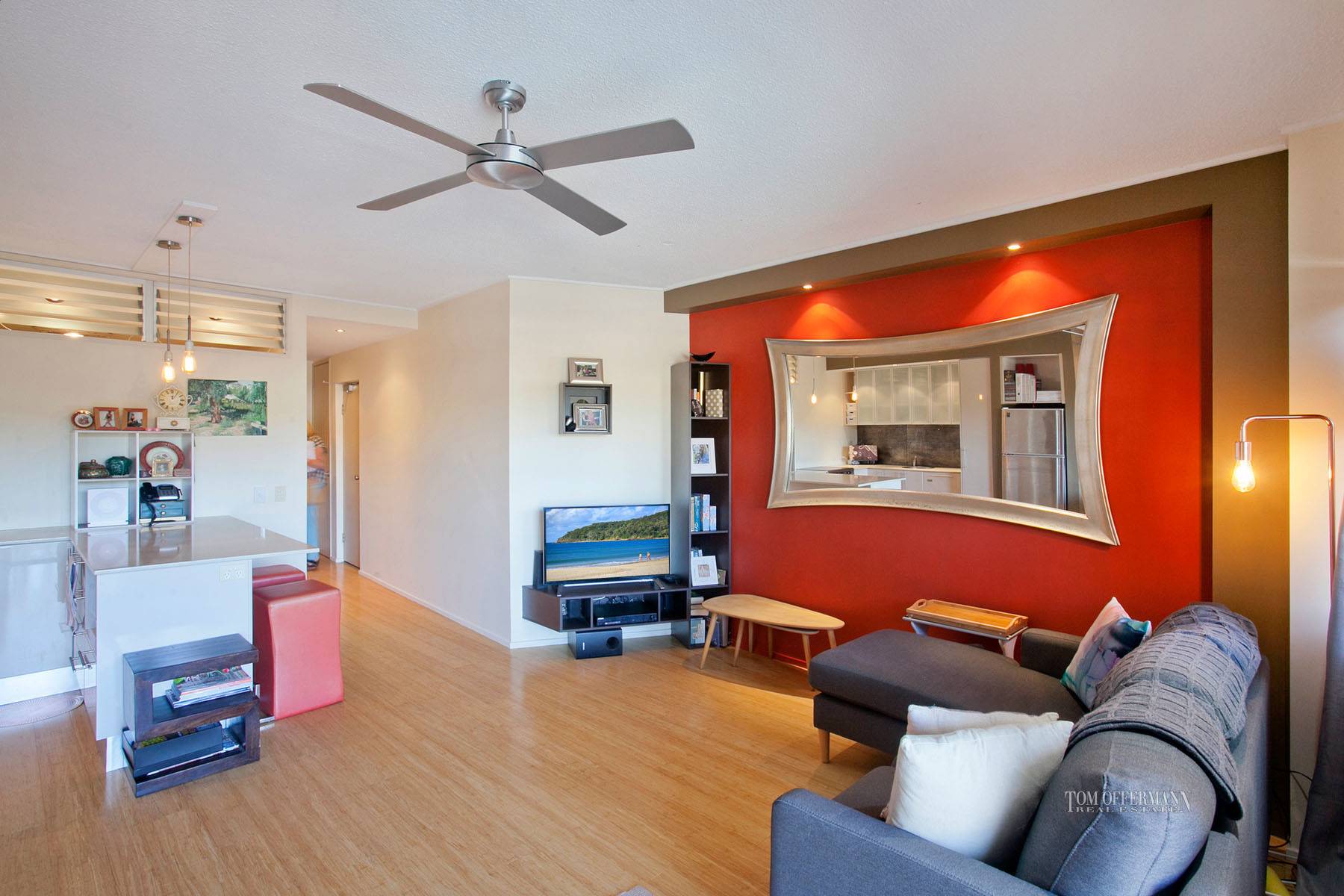 The kitchen has plenty of storage and a breakfast bar; red and white striped tiles add pizzazz to the bathroom; and check out the views from the balcony off the main bedroom.