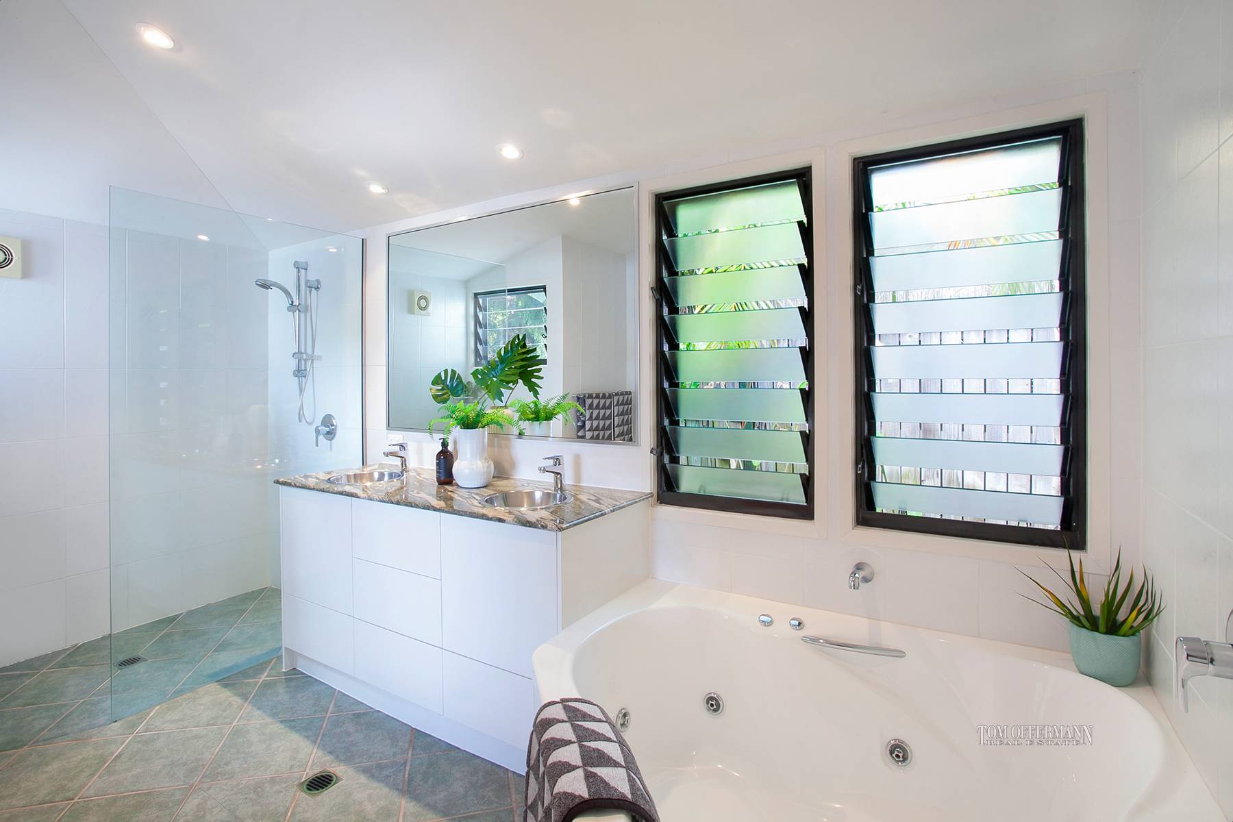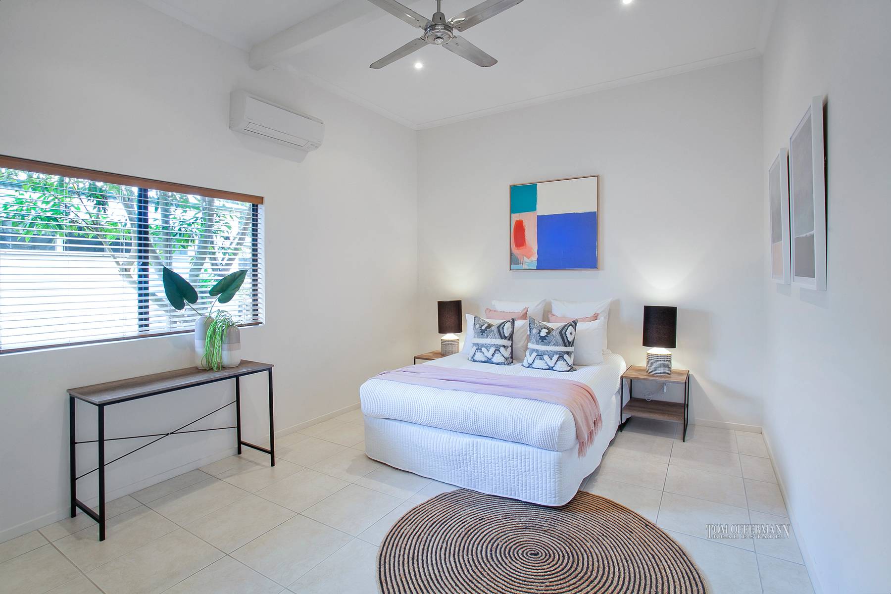 The pool with a large shade-sail, more a private oasis, towards the rear of the block is set amongst east-care tropical gardens. There's an access from the deck of the king-sized master suite with its walk-in robe, spa and a vanity with double basins.