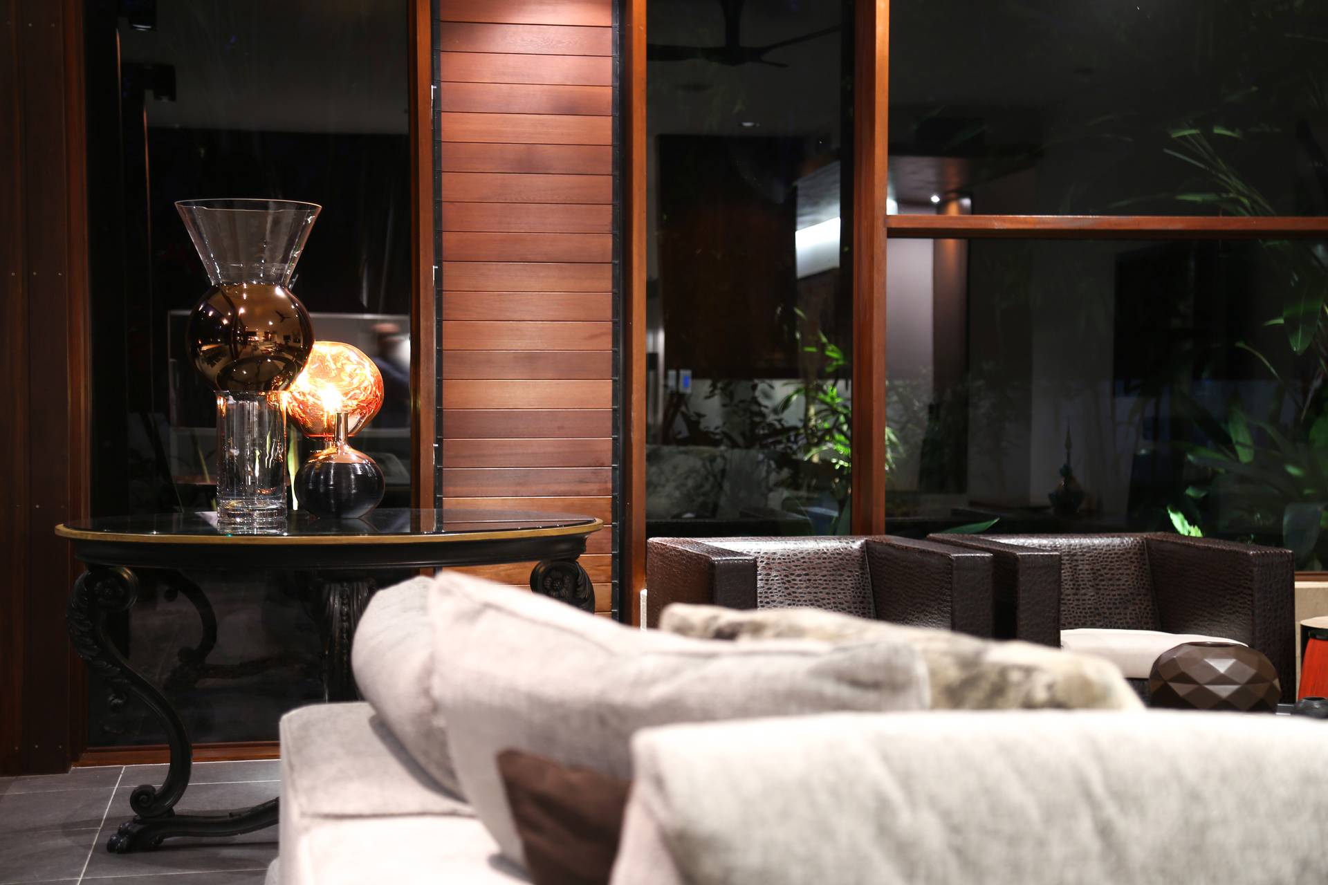 It's easy to be captivated by the slick and sumptuous textures, finishing touches and inspired pieces that meld style with practicality, but there's more. The central staircase with timber beams through the central void is another masterstroke. Adding further drama is a wall of glass also a vertical garden in the courtyard.