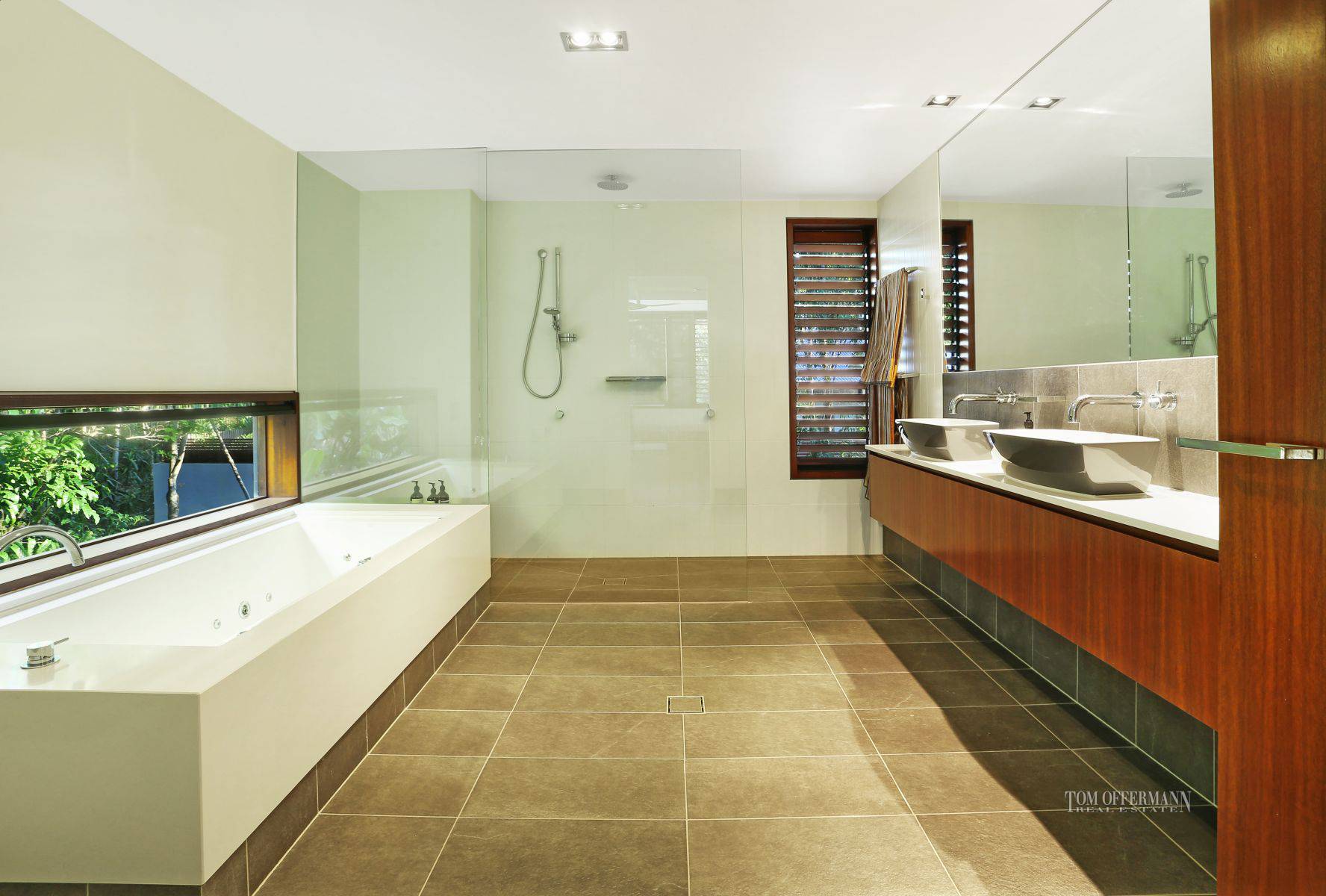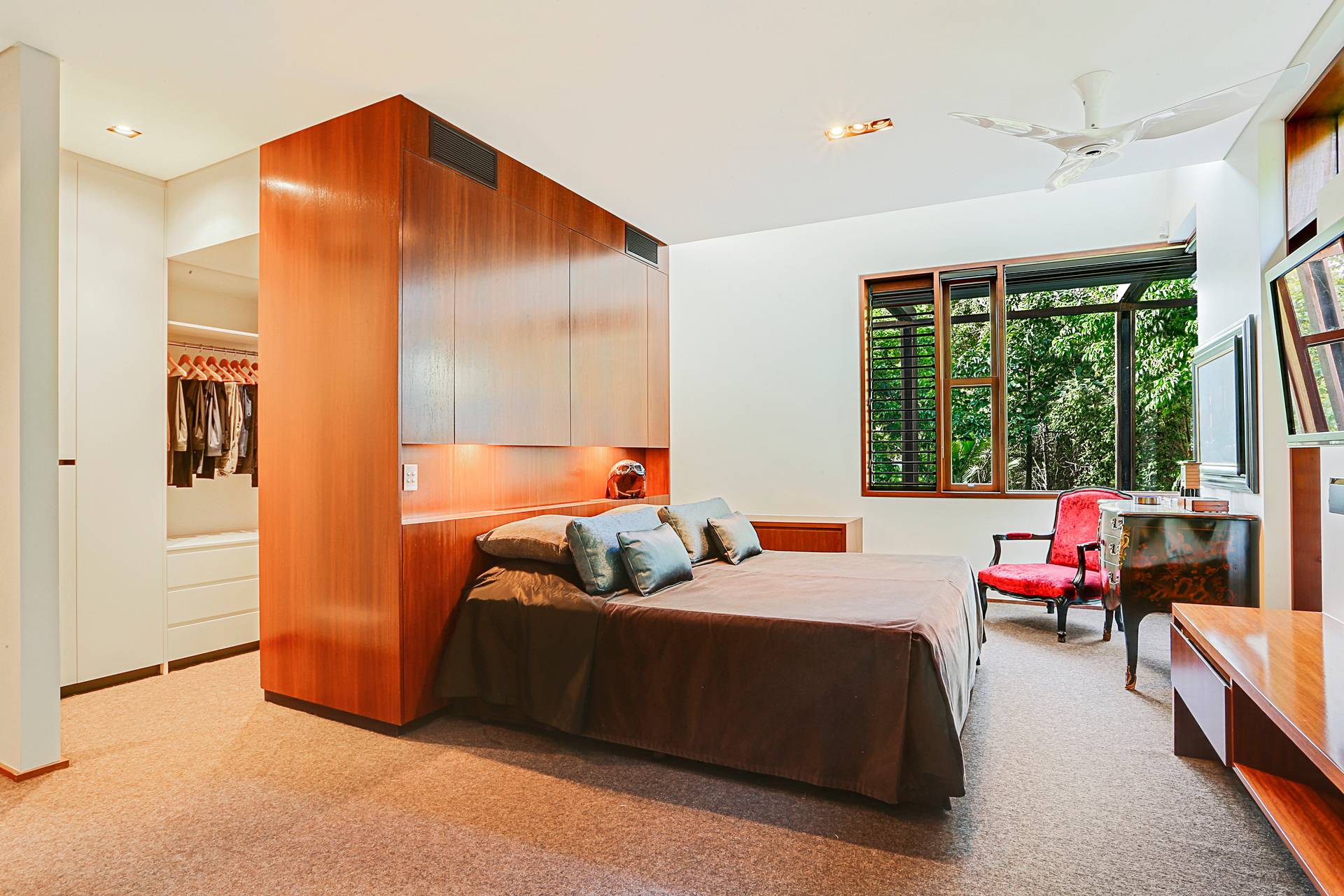 The north-facing oversize master suite with its walk-through sensor-lit robe, ensuite with large multi jet spa and walk-in shower, evokes an oasis of calm.