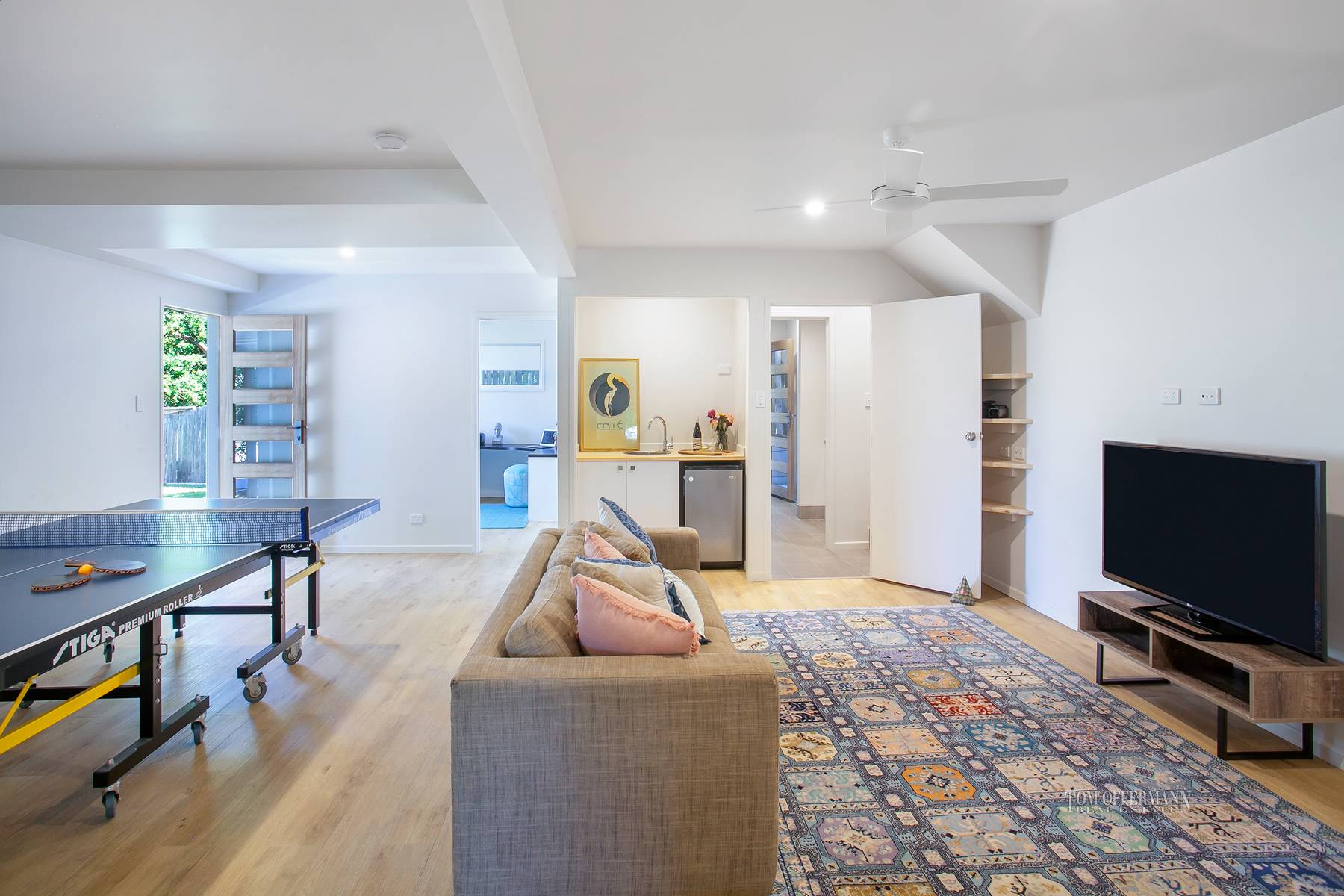 This family beach house offers a relaxed ambience. The stunning kitchen is open plan and is located in the heart of the house all living areas flow directly off this space. The property is split level in design and offers excellent accommodation with 3 bedrooms on the upper level of the property, the master bedroom has its own ensuite and then there is another 2 bedrooms downstairs along with large home office or studio with separate entrance should you work from home. There is a large separate living space downstairs complete with sink and small fridge.