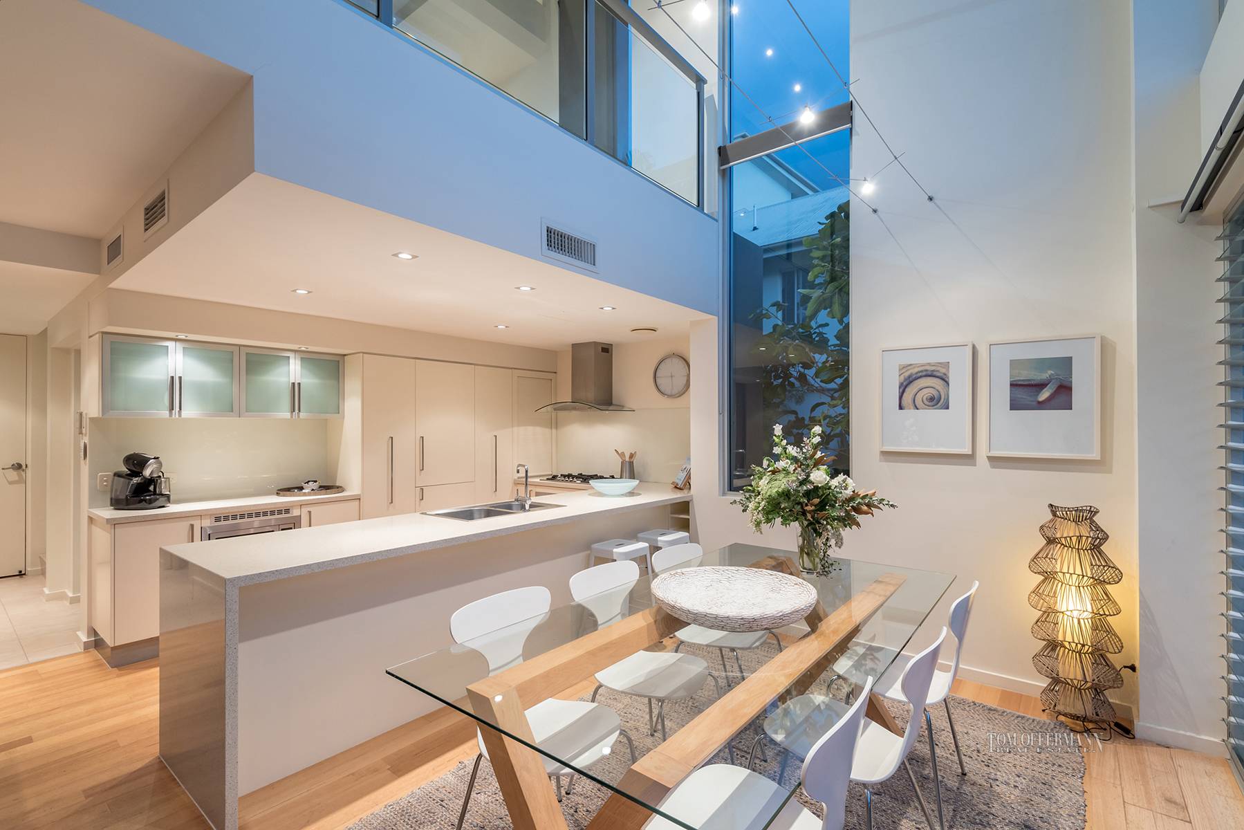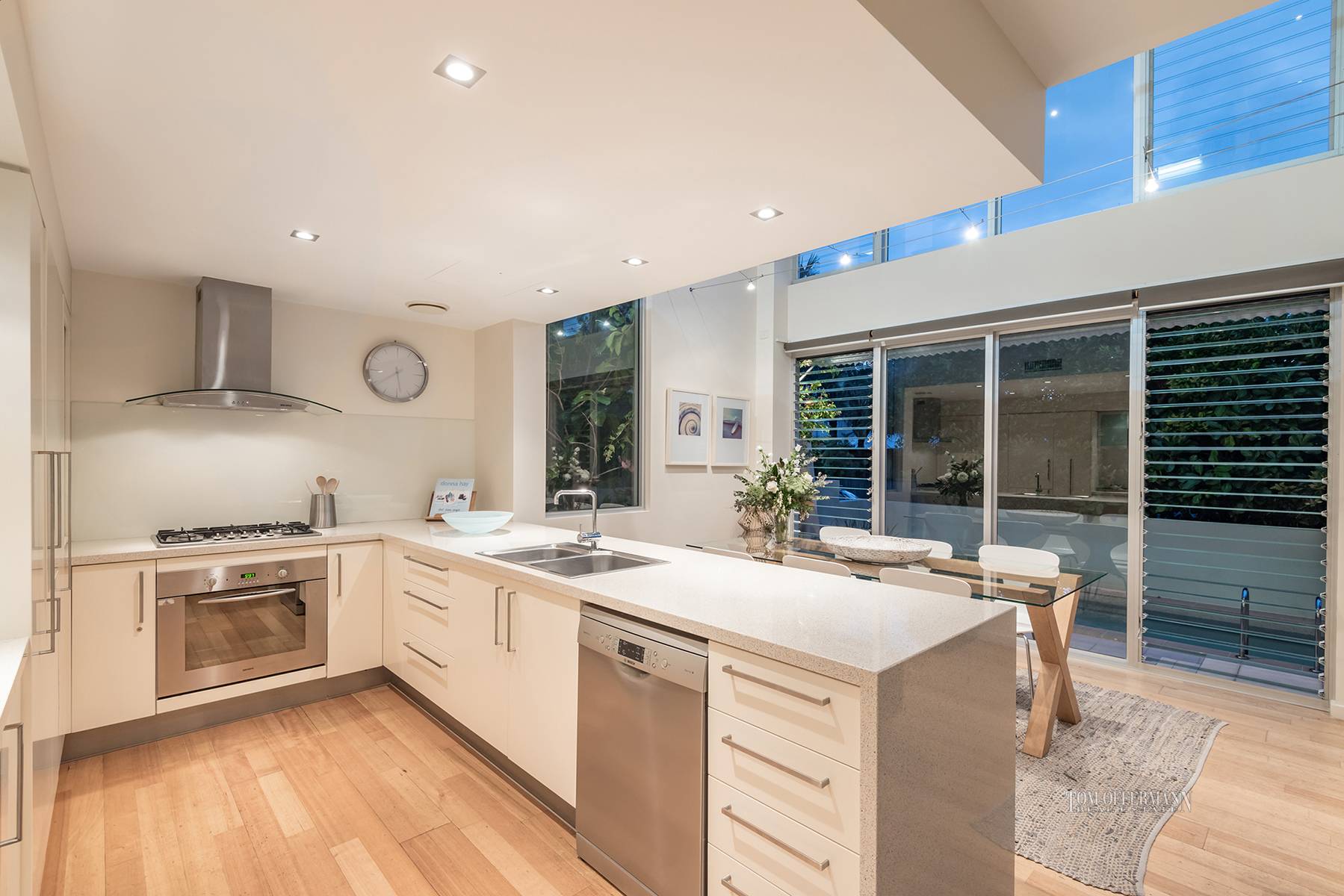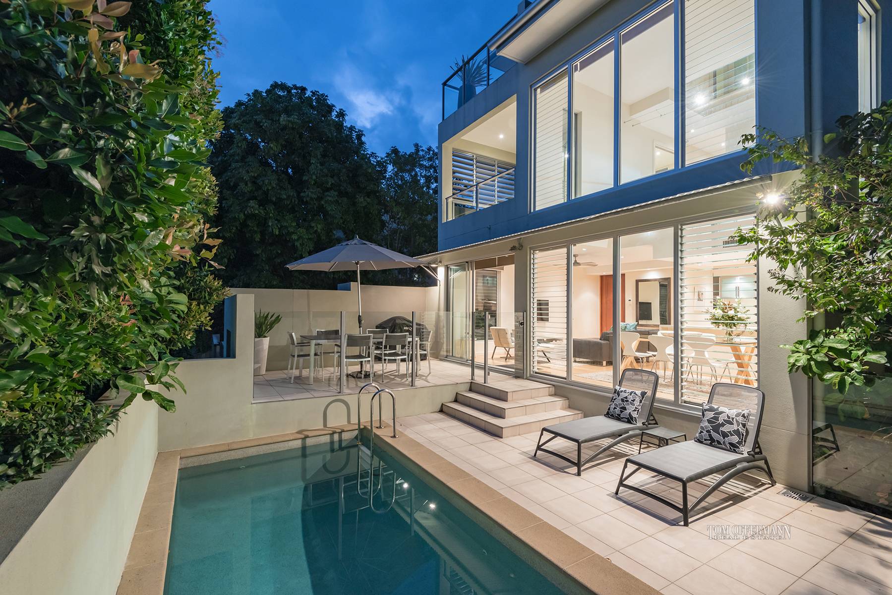 Admire the massive wall of double-ceiling-height glass, a bank of louvres, glistening heated pool, sun terrace and alfresco dining space.