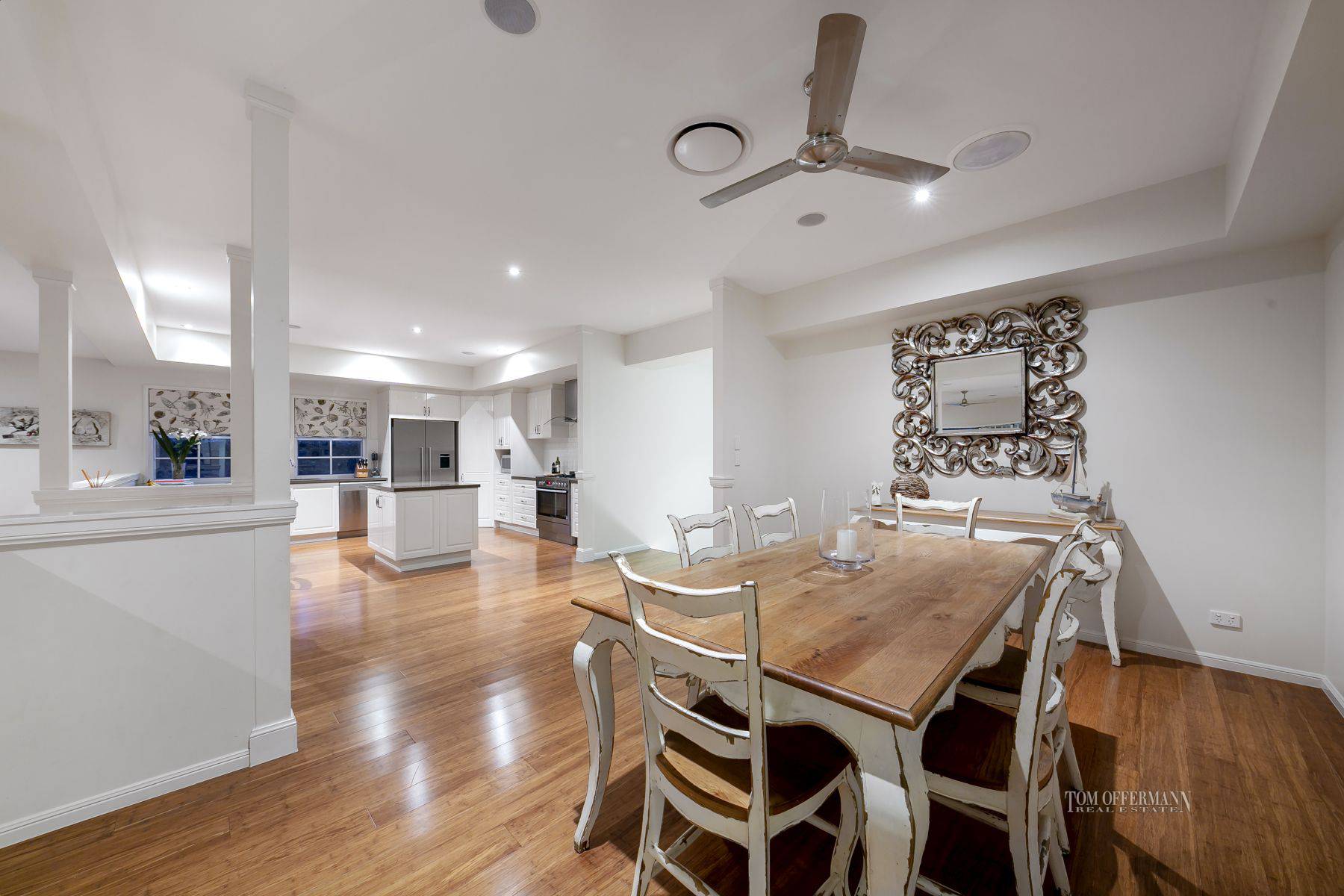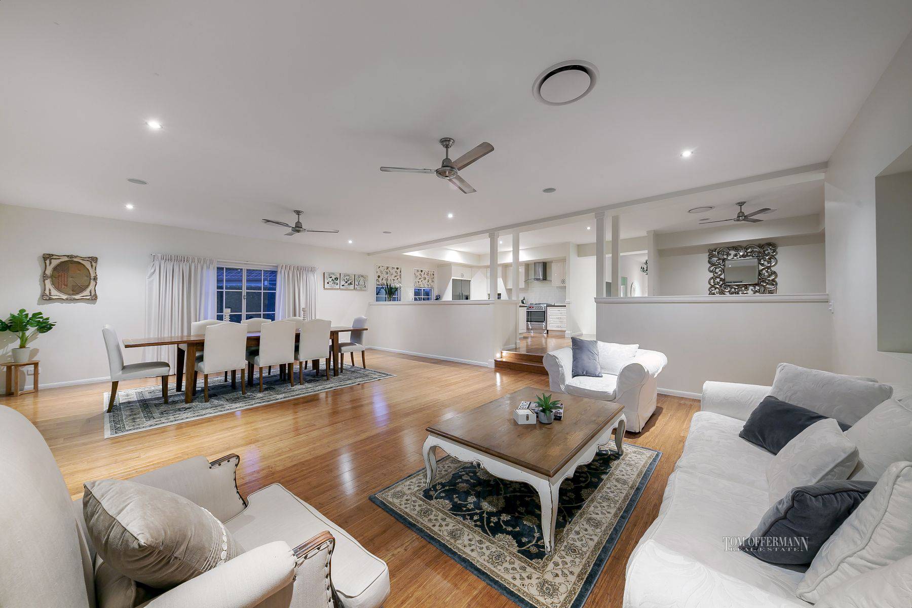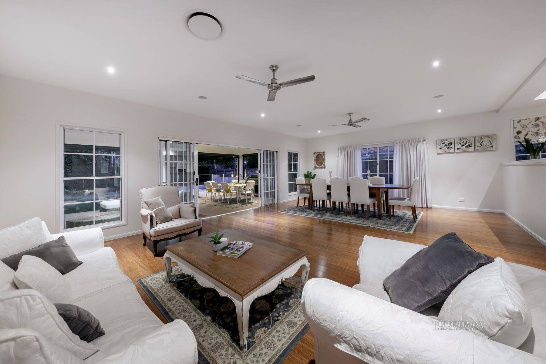 Stepping down, the expansive lounge and formal dining is a pleasure and leaves you with endless opportunity to create your own space. Gaze through the criss-cross windows or step through to the chic alfresco and admire the travertine tile surrounded pool and soak in the remainder of the oversized back lawn.
