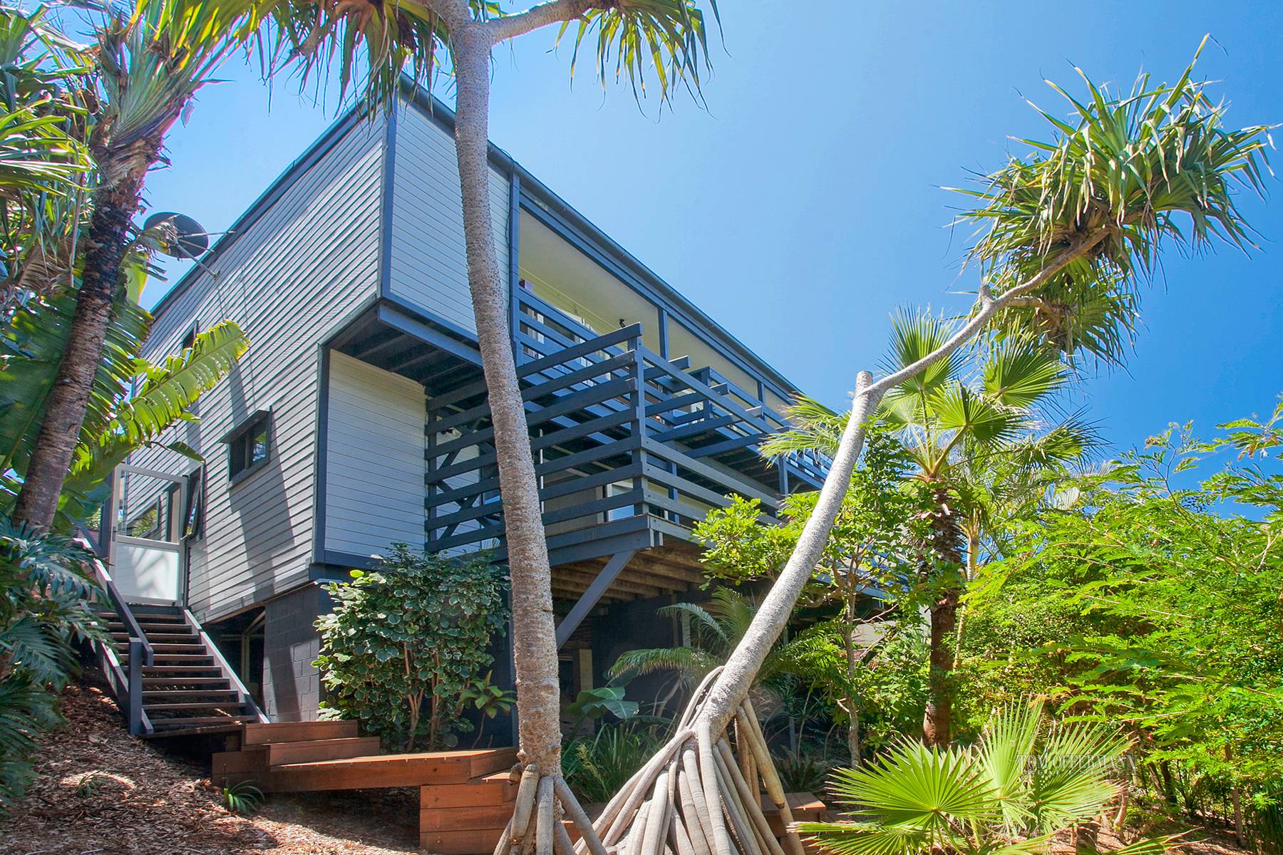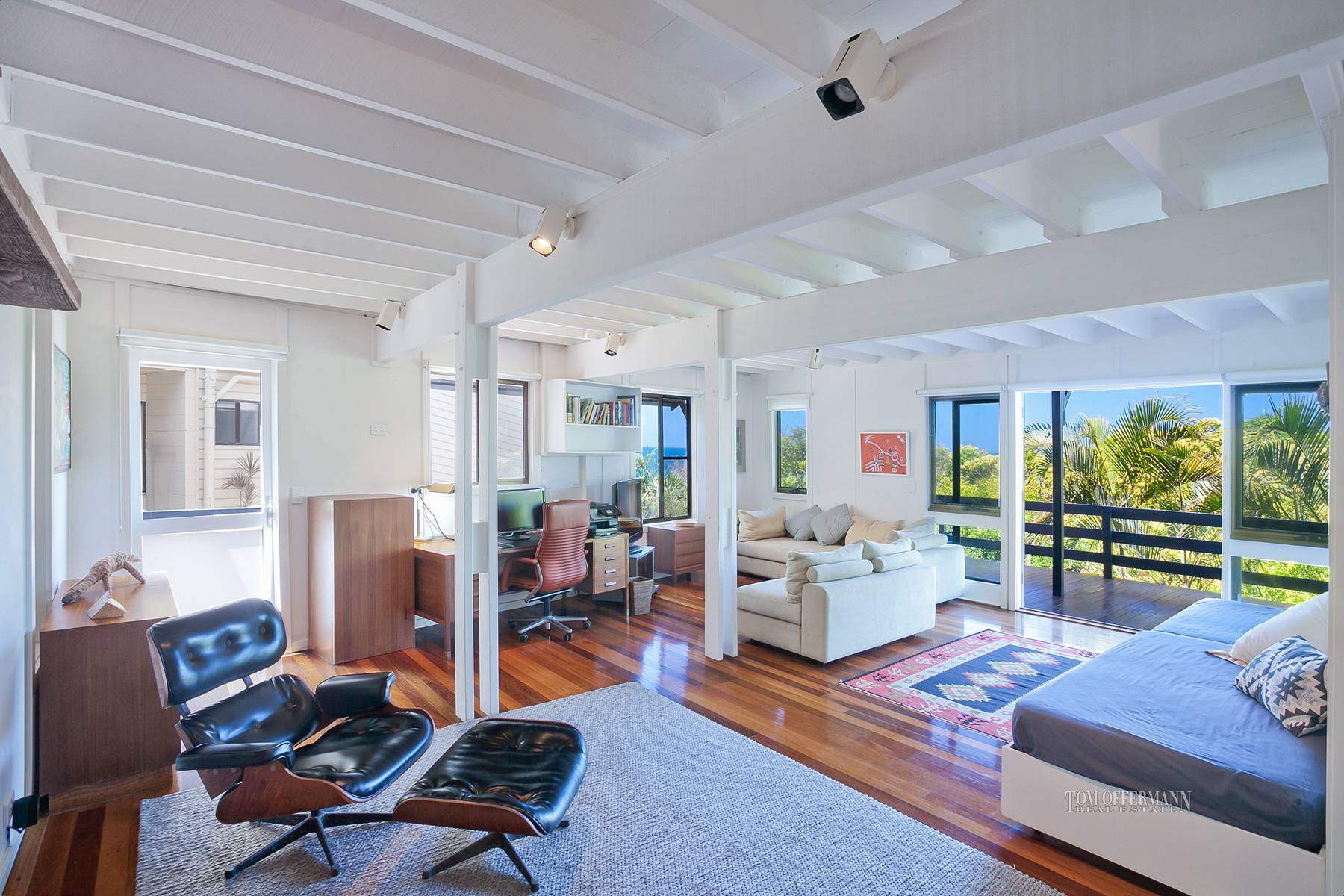 Mature Pandanus in the front garden are synonymous of a beach landscape and as you would expect, indoors is evocative of an enviable beach lifestyle. The massive upstairs lofty-ceilinged, open-plan living and dining spaces, plus kitchen with stainless steel bench tops, have polished Brushbox floors. Major features include the sandstone open fireplace and a full complement of picture windows and doors opening onto a wide deck with a seamless view north to Lions Heads and stretch south across the Coral Sea to what seems like forever. A master ensuite also enjoys the deck space where entertaining alfresco is a given.