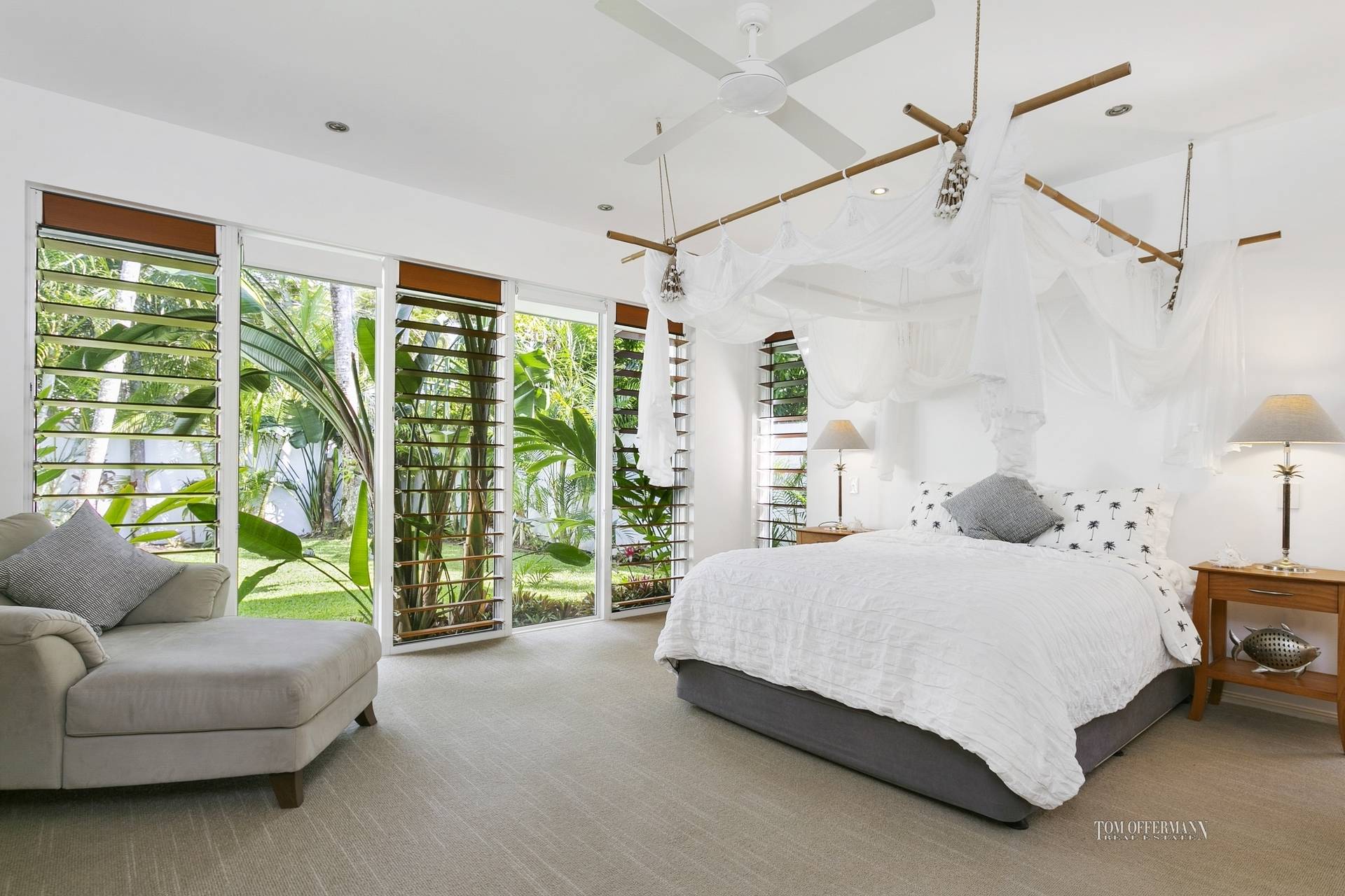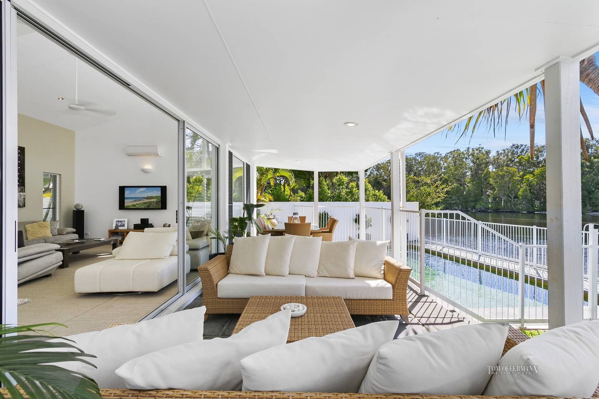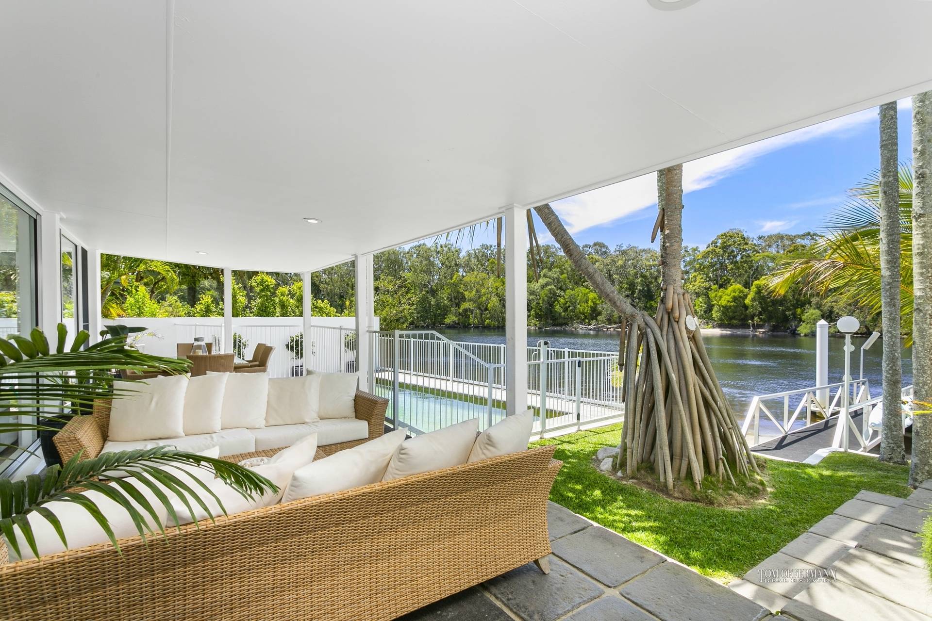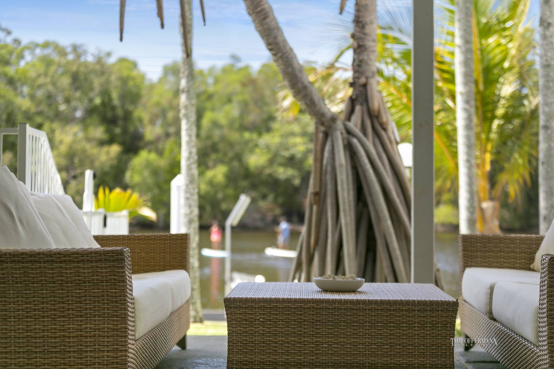 Open the big bold front doors and be forgiven for thinking you've checked into a luxury retreat. Engage with the structural simplicity which is based on architectural form and respect for the idyllic sub-tropical climate; admire the chandelier; note the brightness of the high spaces, white porcelain tiles and pops of colour; and look beyond to the living artwork of a wide river frontage fringed by Pandanus, palms and frangipanis with a nature reserve backdrop.