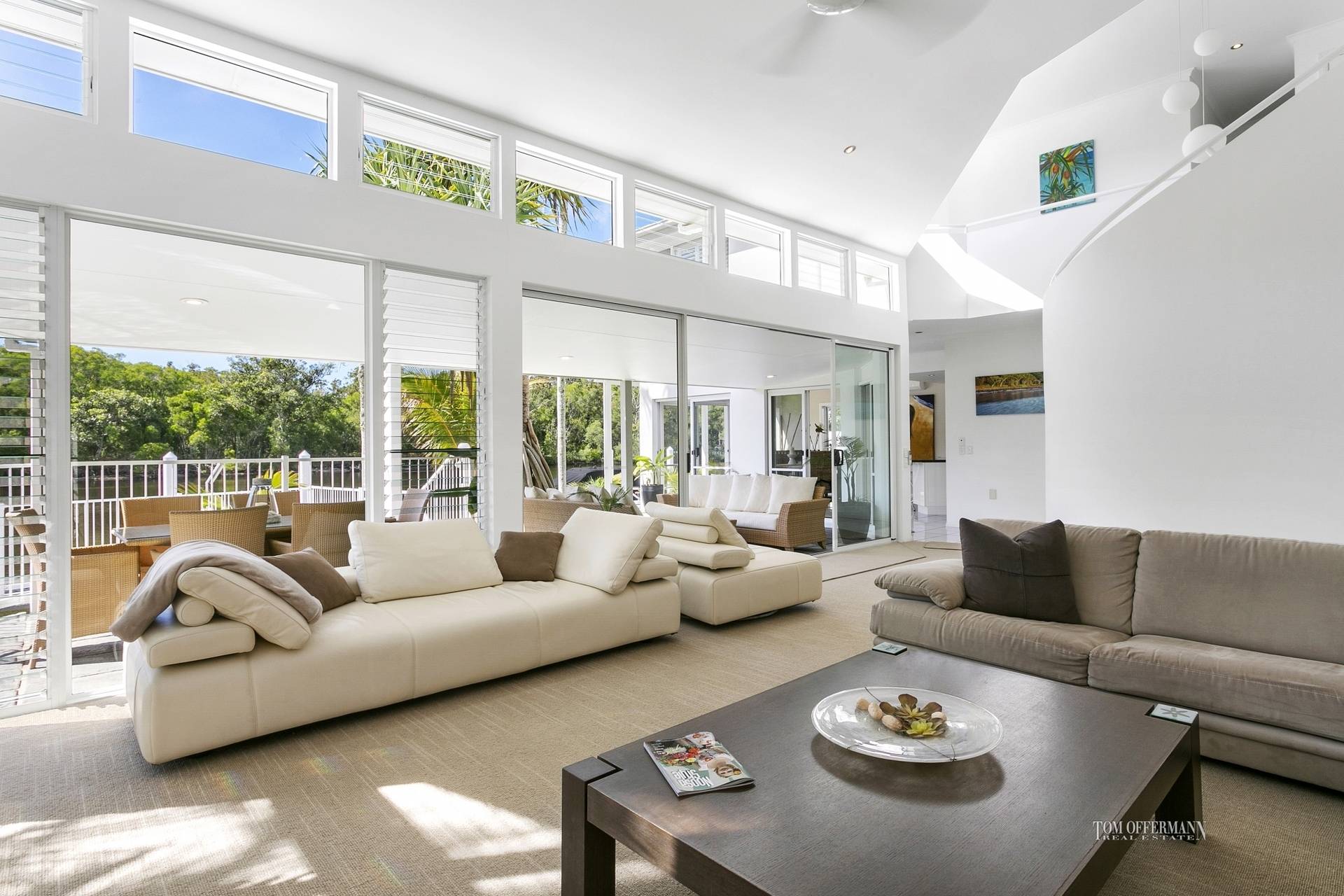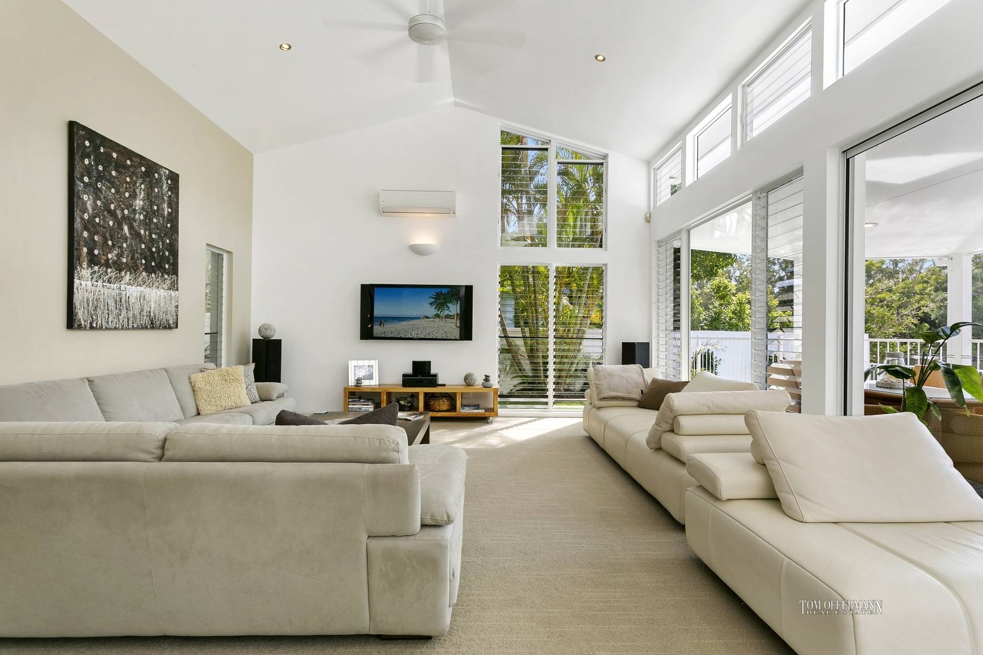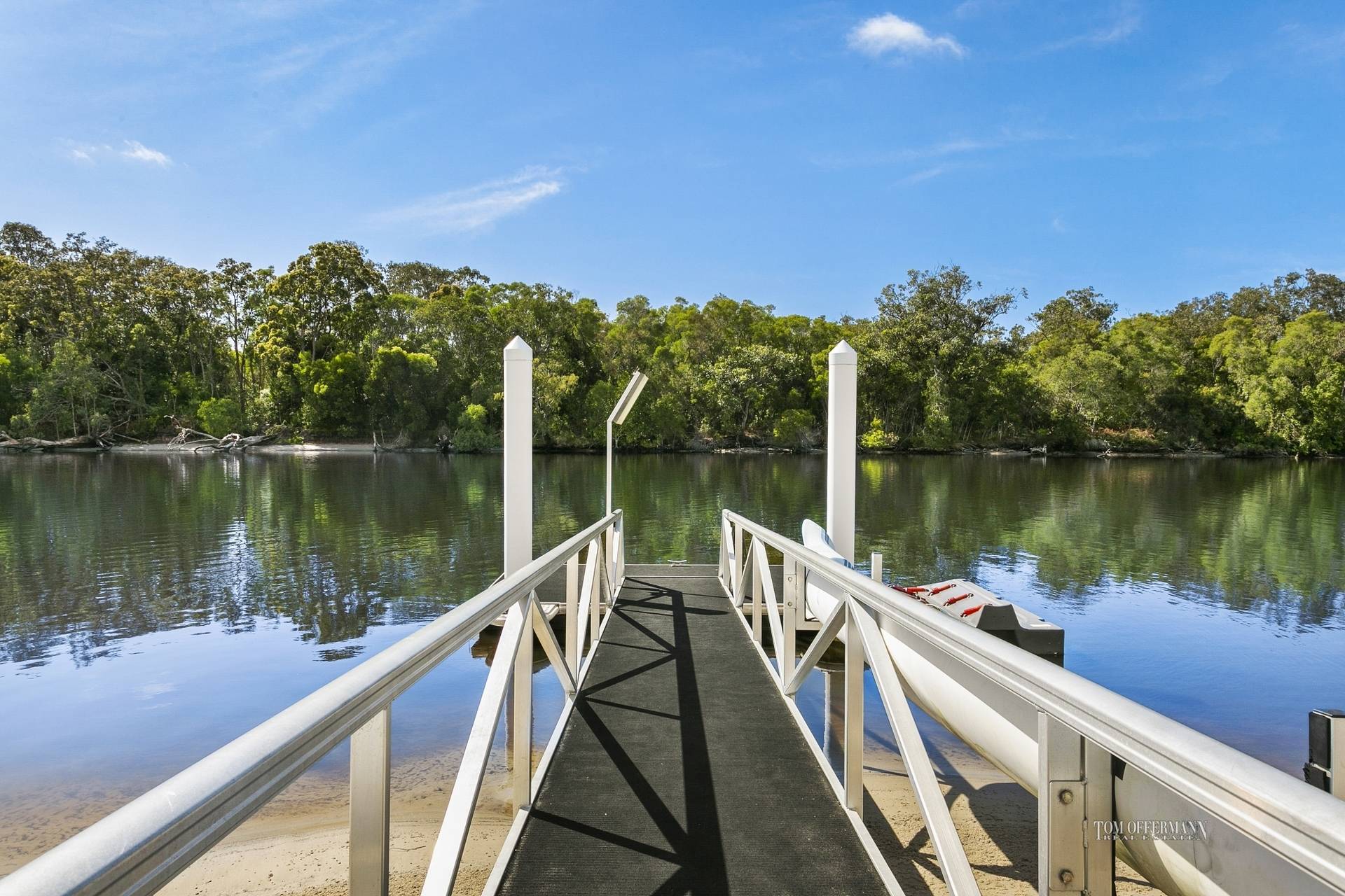 Open the big bold front doors and be forgiven for thinking you've checked into a luxury retreat. Engage with the structural simplicity which is based on architectural form and respect for the idyllic sub-tropical climate; admire the chandelier; note the brightness of the high spaces, white porcelain tiles and pops of colour; and look beyond to the living artwork of a wide river frontage fringed by Pandanus, palms and frangipanis with a nature reserve backdrop.
