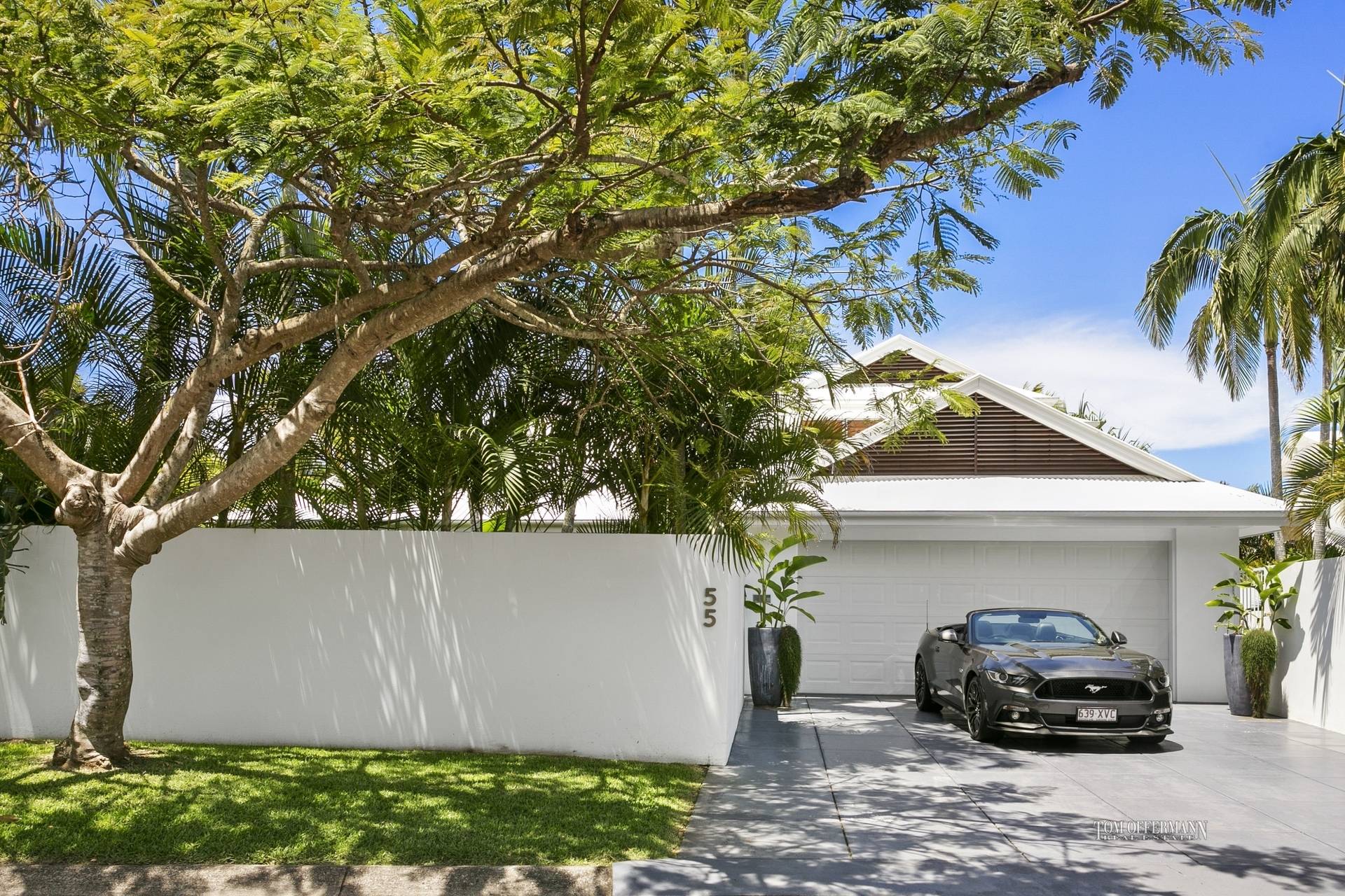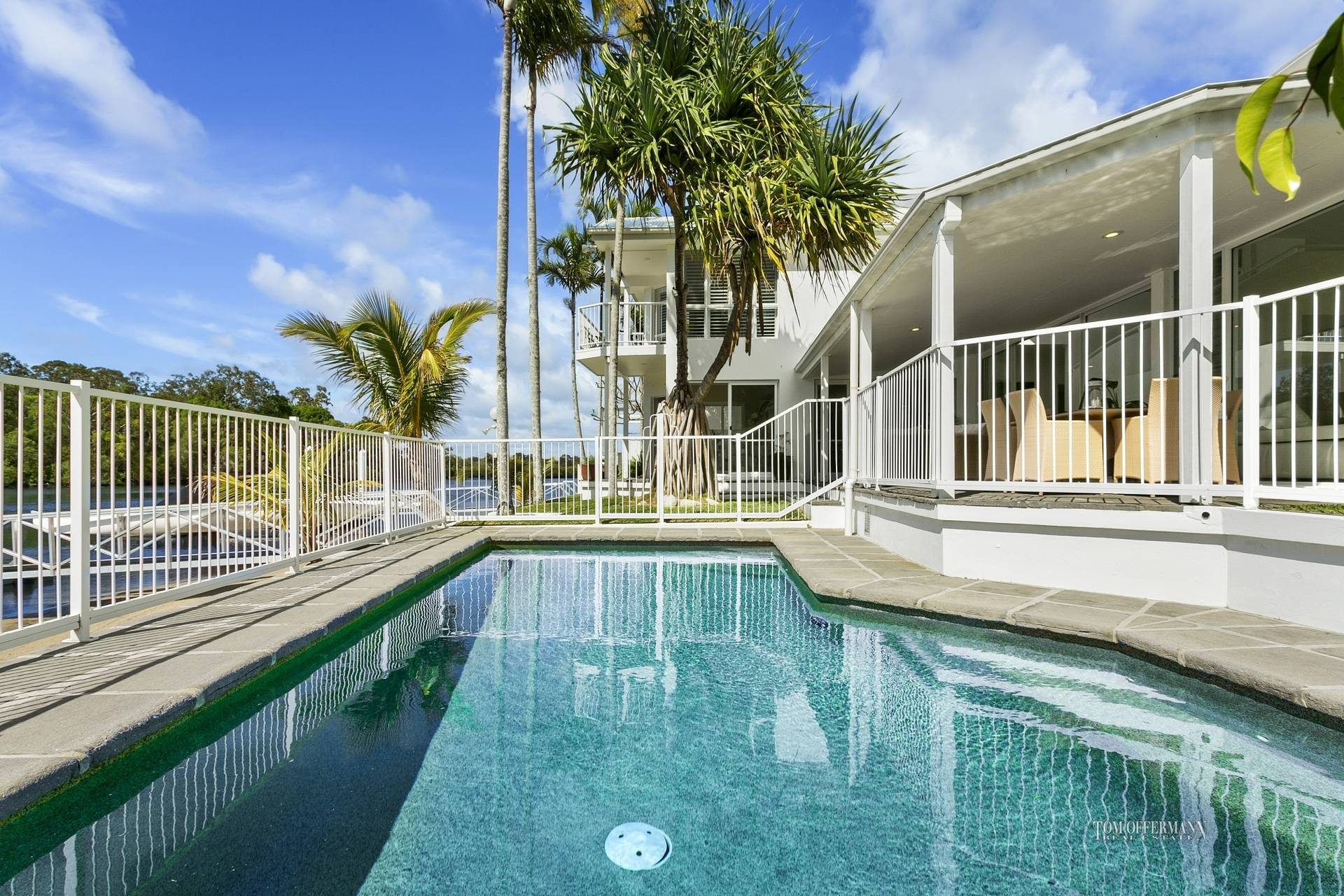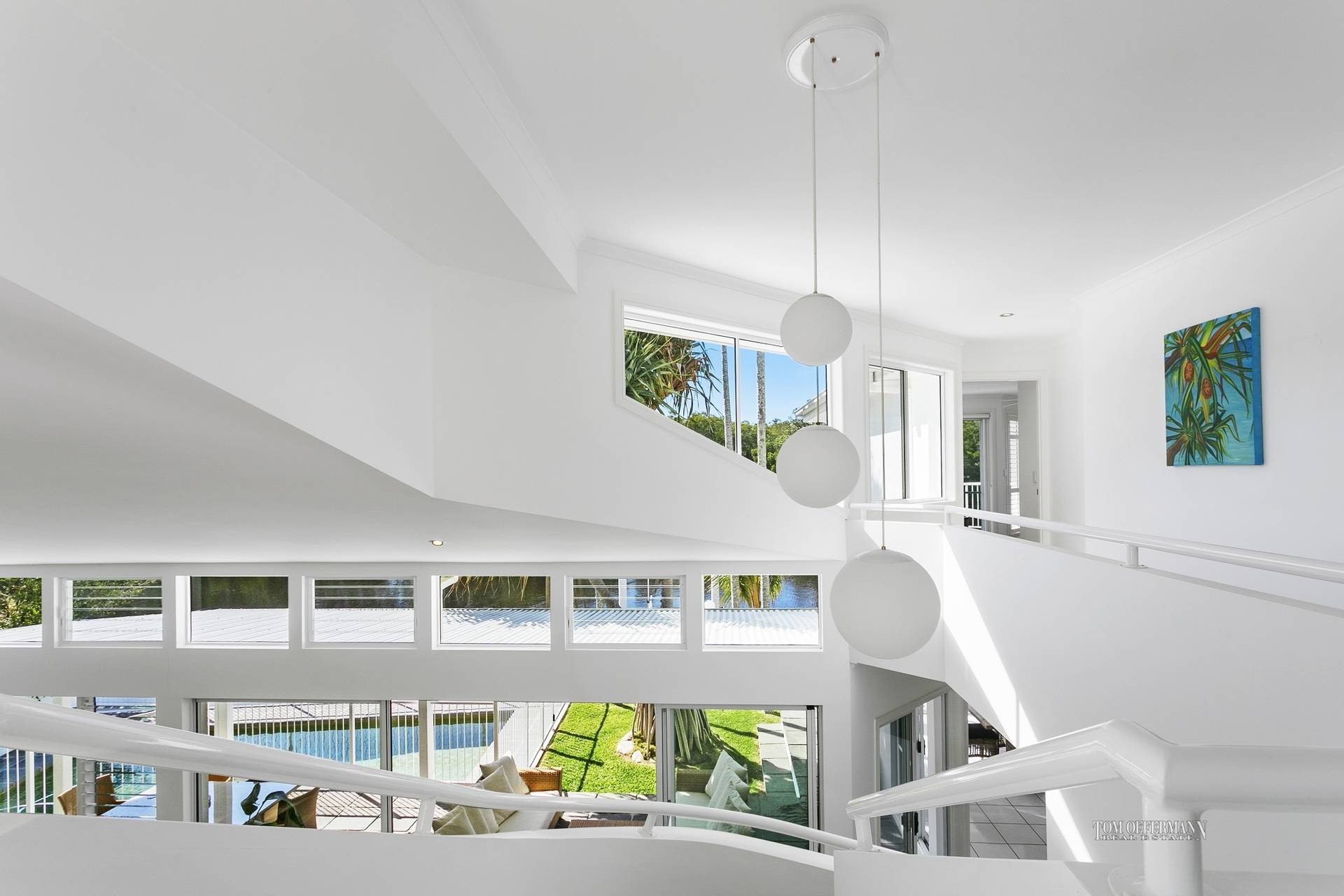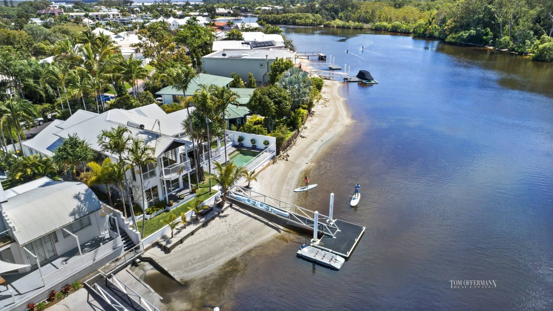 Open the big bold front doors and be forgiven for thinking you've checked into a luxury retreat. Engage with the structural simplicity which is based on architectural form and respect for the idyllic sub-tropical climate; admire the chandelier; note the brightness of the high spaces, white porcelain tiles and pops of colour; and look beyond to the living artwork of a wide river frontage fringed by Pandanus, palms and frangipanis with a nature reserve backdrop.