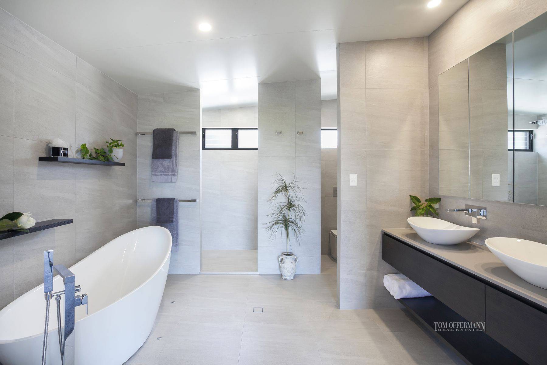 There's an emphasis throughout on well-proportioned, over-generous spaces, high ceilings up to three metres, breezeways such as louvres, superb craftsmanship plus premium fixtures and fittings. The lavish master ensuite with massive bathroom, egg-shaped bath, Caesar-stone double vanity, walk-in robe, titled balcony and 'those' views, is no exception.