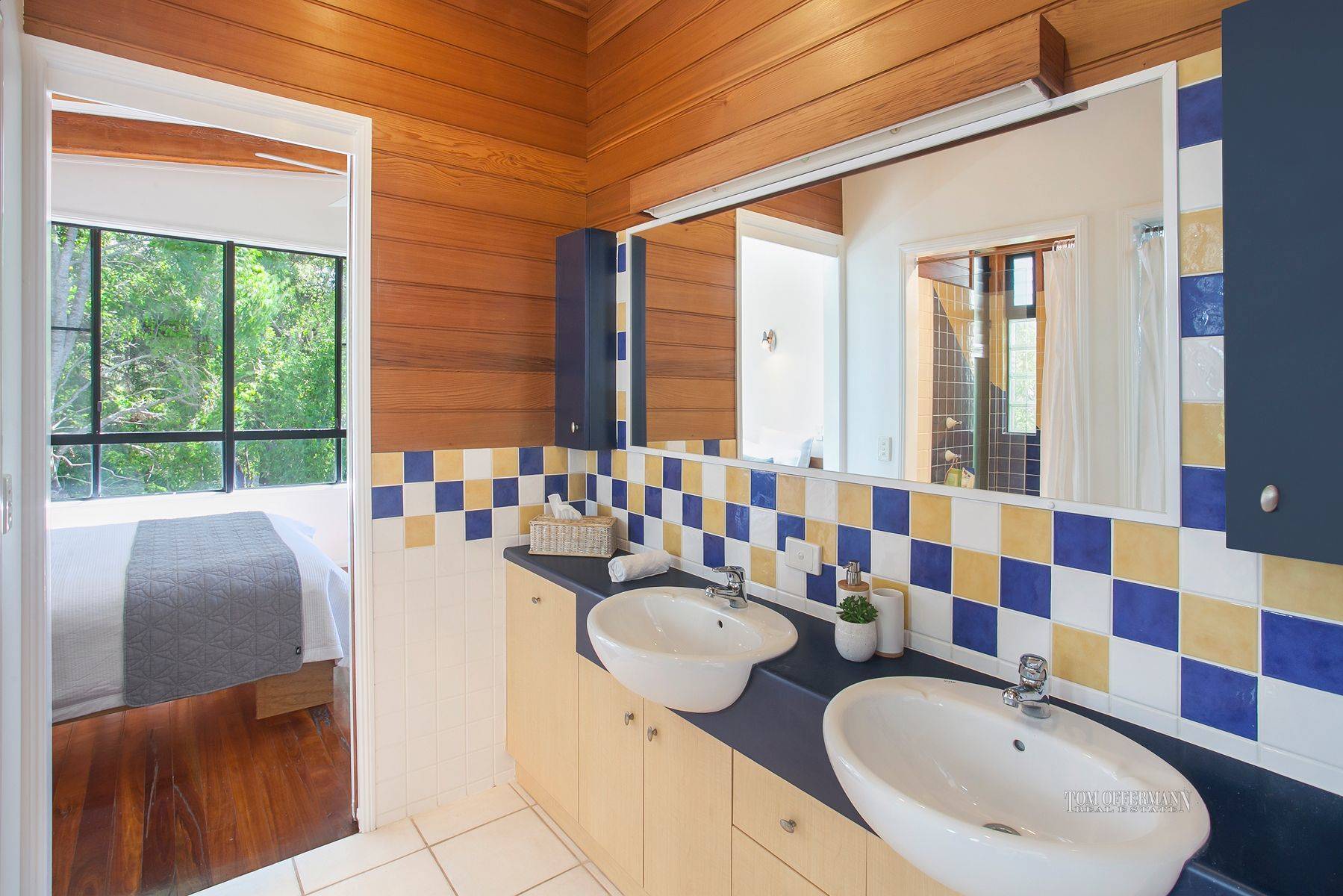 Two kids' bedrooms with a bright yellow and blue-tiled bathroom and walk-in robe are in a sound-proofed wing and a guest bedroom or studio with double-glazed doors, a bathroom plus a balcony opening to the reserve, is accessed from the other wing.