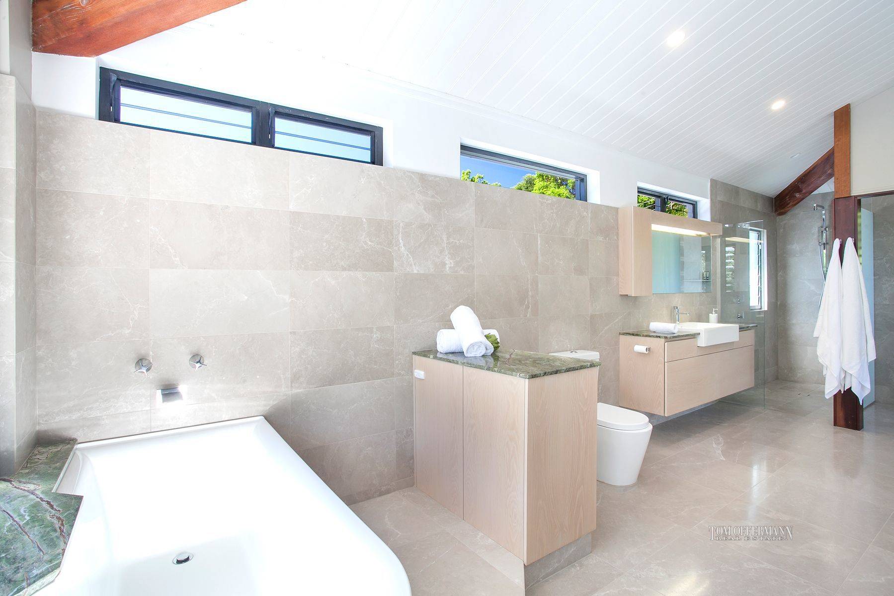 On the upper level is a palatial master suite with a massive walk-in robe and storage, a spa bath looking over the bush canopy plus a classy green marble-topped vanity.