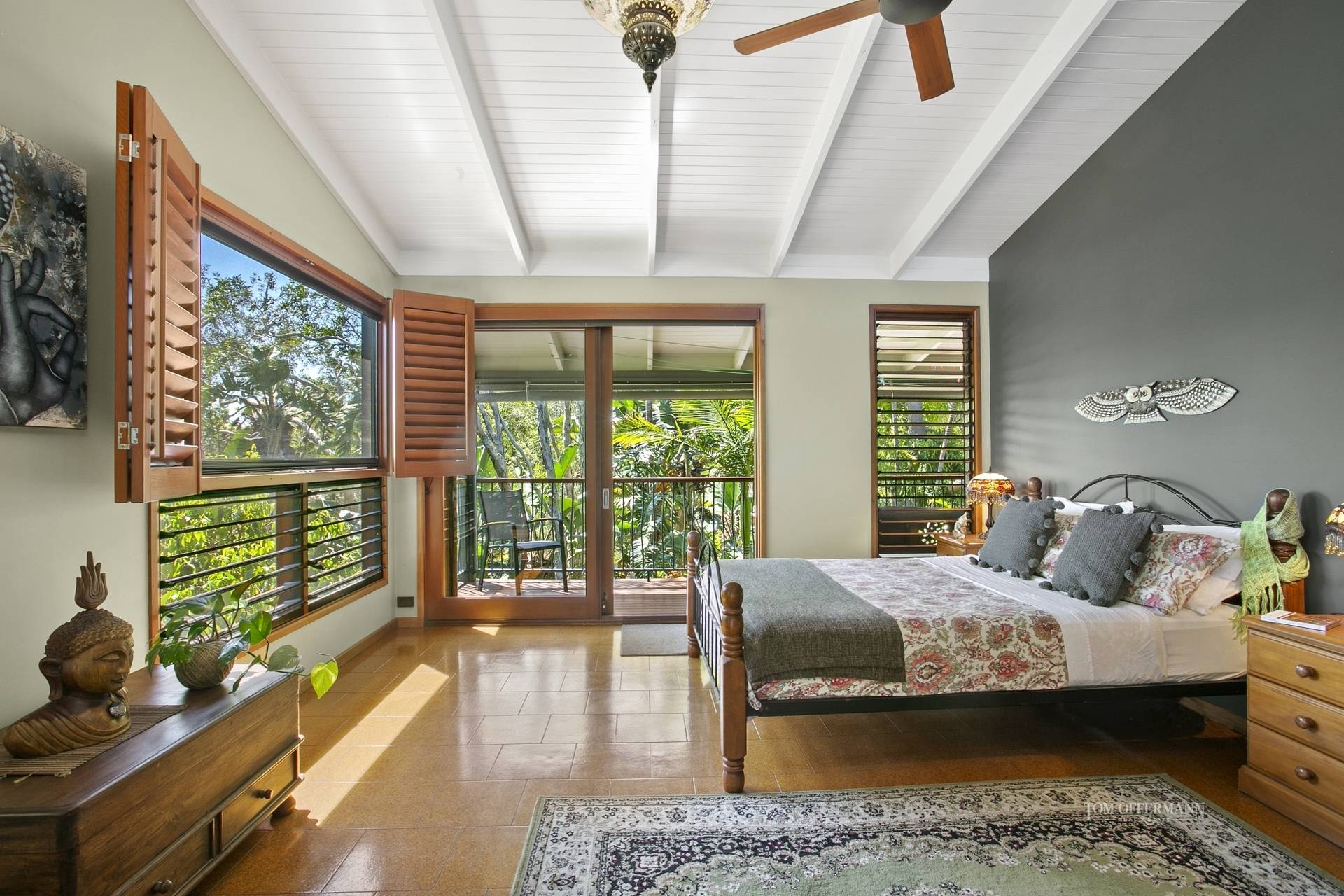 Downstairs you find another 2 bedrooms along with a large second living area. These bedrooms and living areas open outside to covered patio spaces that blend into the tropical gardens that surround the property.