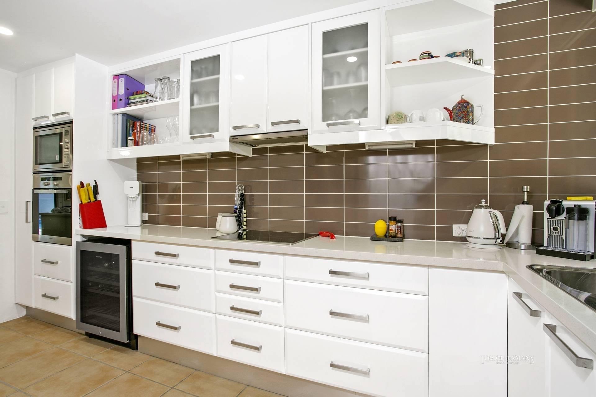 It's an 'aha moment' stepping inside the contemporary 3-bedroom duplex with an oh-so-cool bright white palette throughout and augmented by splashes of aqua accessories, in the large open plan living and dining space. There's a clever purpose-built television 'island' in the centre, also on one side, a desk.
